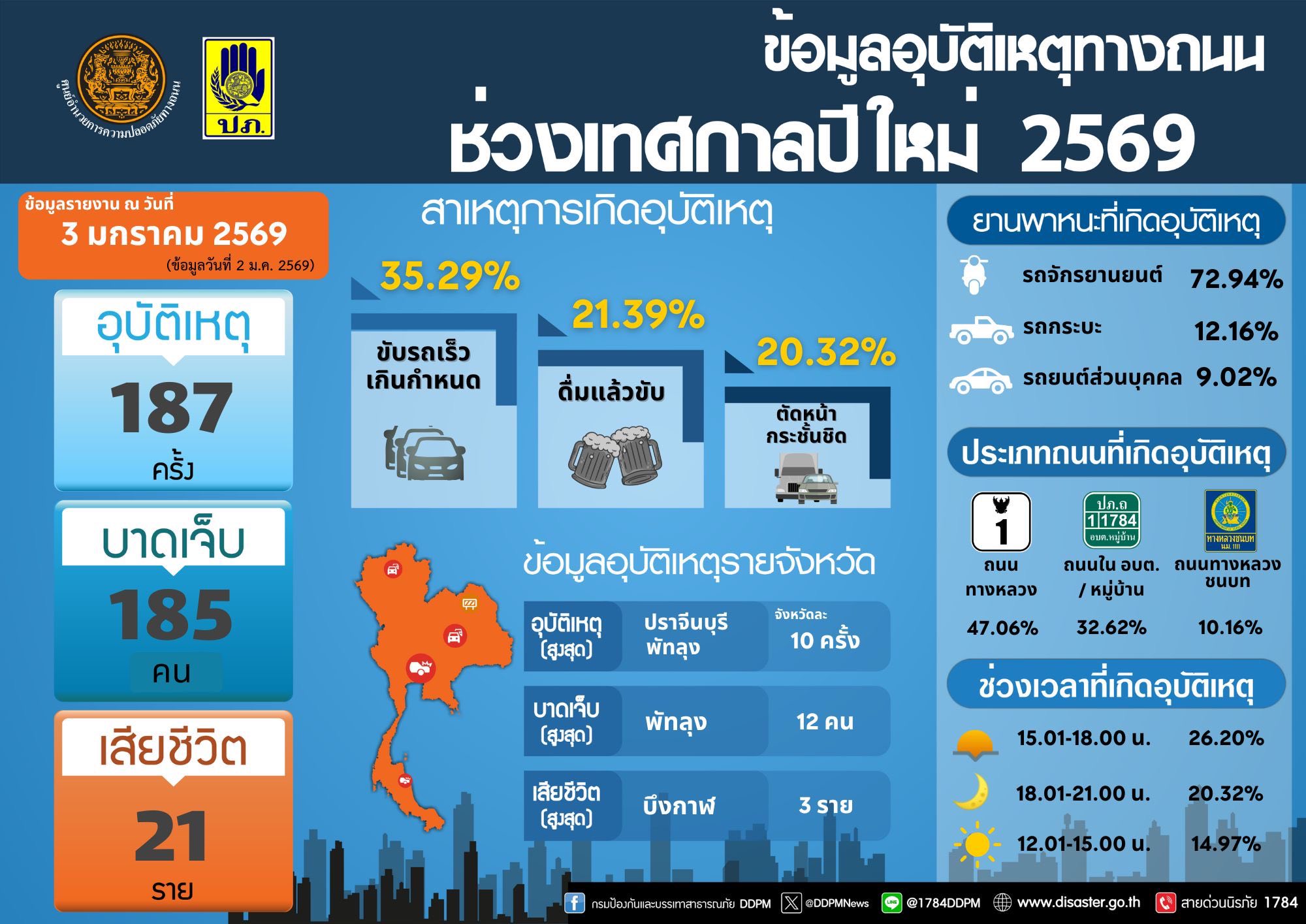 พล.ต.ท. รุทธพล เนาวรัตน์ รัฐมนตรีว่าการกระทรวงยุติธรรม ประธานแถลงข่าวสรุปผลการดำเนินงานของศูนย์อำนวยการป้องกันและลดอุบัติเหตุทางช่วงเทศกาลปีใหม่ พ.ศ. 2569 เปิดเผยว่า ศูนย์อำนวยการป้องกันและลดอุบัติเหตุทางถนนช่วงเทศกาลปีใหม่ พ.ศ. 2569 โดยกรมป้องกันและบรรเทาสาธารณภัยและความร่วมมือของภาคีเครือข่ายได้รวบรวมสถิติอุบัติเหตุทางถนน ประจำวันที่ 3 มกราคม 2569 ซึ่งเป็นวันที่สี่ของการรณรงค์ “ขับขี่ปลอดภัย ลดความเร็ว ลดอุบัติเหตุ” เกิดอุบัติเหตุ 187 ครั้ง ผู้บาดเจ็บ 185 คน ผู้เสียชีวิต 21 ราย สาเหตุที่ทำให้เกิดอุบัติเหตุสูงสุด ได้แก่ ขับรถเร็วเกินกำหนด ร้อยละ 35.29 ดื่มแล้วขับ ร้อยละ 21.39 ยานพาหนะที่เกิดอุบัติเหตุสูงสุด ได้แก่ รถจักรยานยนต์ ร้อยละ 72.94 ส่วนใหญ่เกิดบนเส้นทางตรง ร้อยละ 86.10 ถนนกรมทางหลวง ร้อยละ 47.06 ถนนใน อบต./หมู่บ้าน ร้อยละ 10.16 ช่วงเวลาที่เกิดอุบัติเหตุสูงสุด ได้แก่ ช่วงเวลา 15.01 – 18.00 น. ร้อยละ 26.20 ผู้บาดเจ็บและเสียชีวิตสูงสุด อยู่ในช่วงอายุ 20-29 ปี ร้อยละ 15.53 โดยจังหวัดที่เกิดอุบัติเหตุสูงสุด ได้แก่ ปราจีนบุรีและพัทลุง (จังหวัดละ 10 ครั้ง) จังหวัดที่มีผู้บาดเจ็บสูงสุด ได้แก่ พัทลุง (12 คน) จังหวัดที่มีผู้เสียชีวิตสูงสุด ได้แก่ บึงกาฬ (3 ราย)