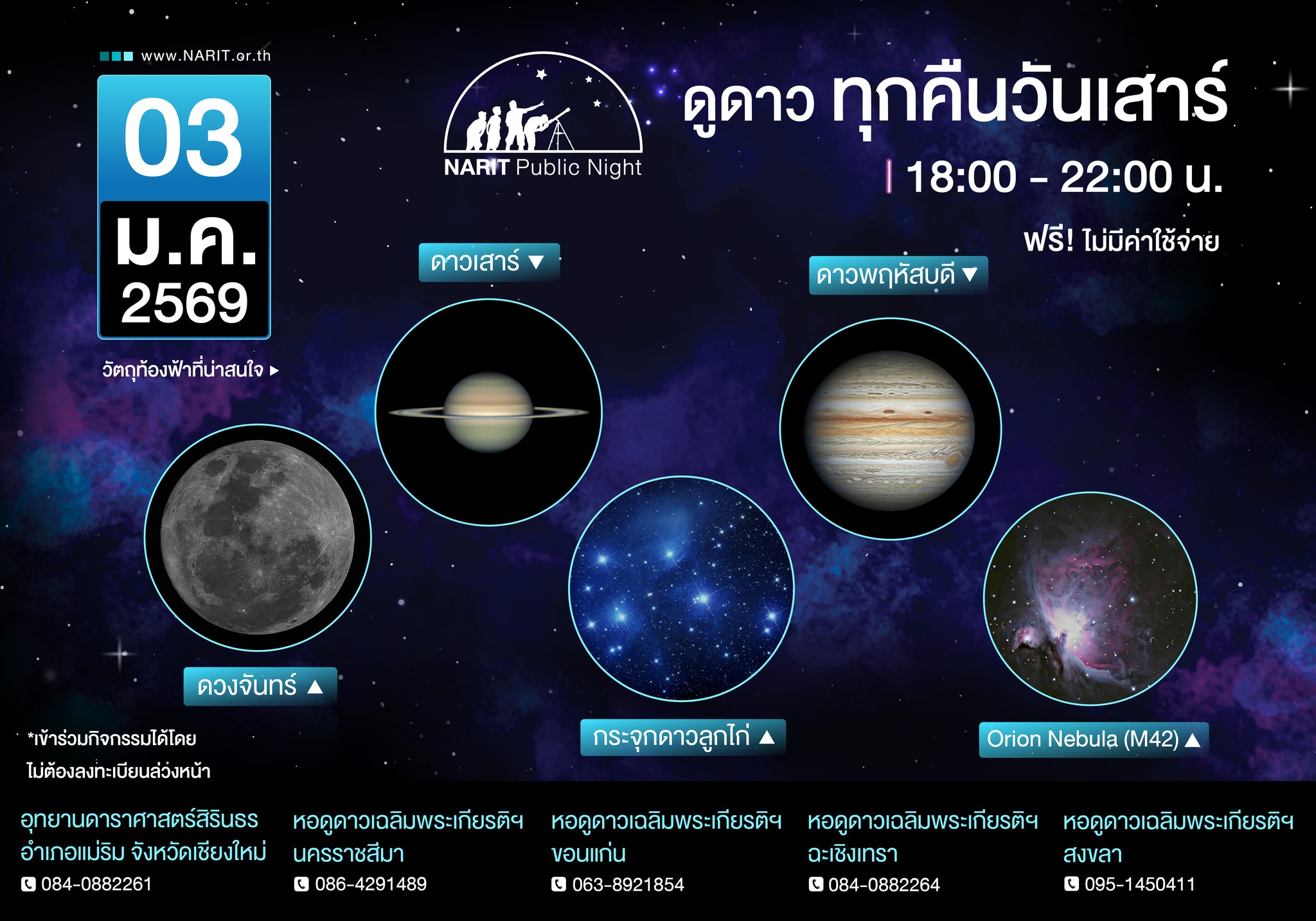 ทุกคืนวันเสาร์ เรามีนัดกันกับกิจกรรม NARIT Public Night ฟรีไม่มีค่าใช้จ่ายไม่ว่าจะอยู่หนใด และ พิเศษ รับ NARIT Point เมื่อเข้าร่วมกิจกรรมแต่ละครั้งสะสมแต้มผ่านไลน์แลกรับของที่ระลึกสุดลิมิเต็ดหลายรายการไม่ว่าจะอยู่หนใด ใกล้ที่ไหนไปที่นั่น