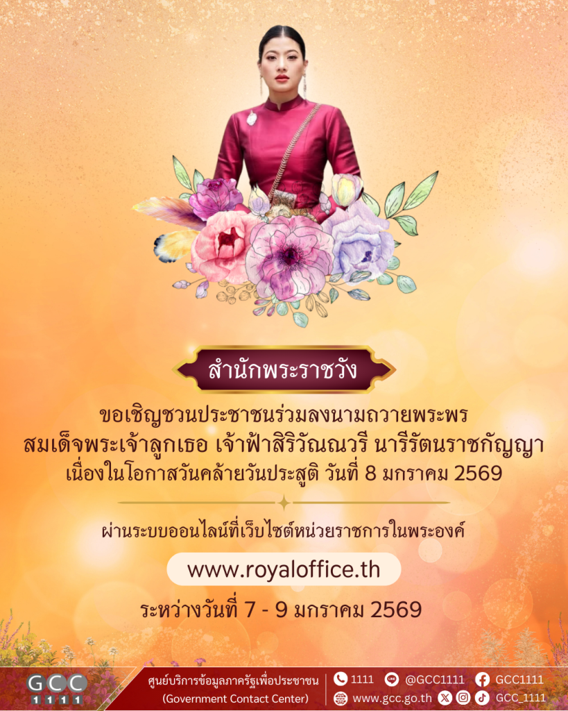 สำนักพระราชวัง ขอเชิญชวนประชาชนร่วมลงนามถวายพระพร สมเด็จพระเจ้าลูกเธอ เจ้าฟ้าสิริวัณณวรี นารีรัตนราชกัญญา เนื่องในโอกาสวันคล้ายวันประสูติ วันที่ 8 มกราคม 2569 ผ่านระบบออนไลน์ที่เว็บไซต์หน่วยราชการในพระองค์ www.royaloffice.th ระหว่างวันที่ 7 – 9 มกราคม 2569