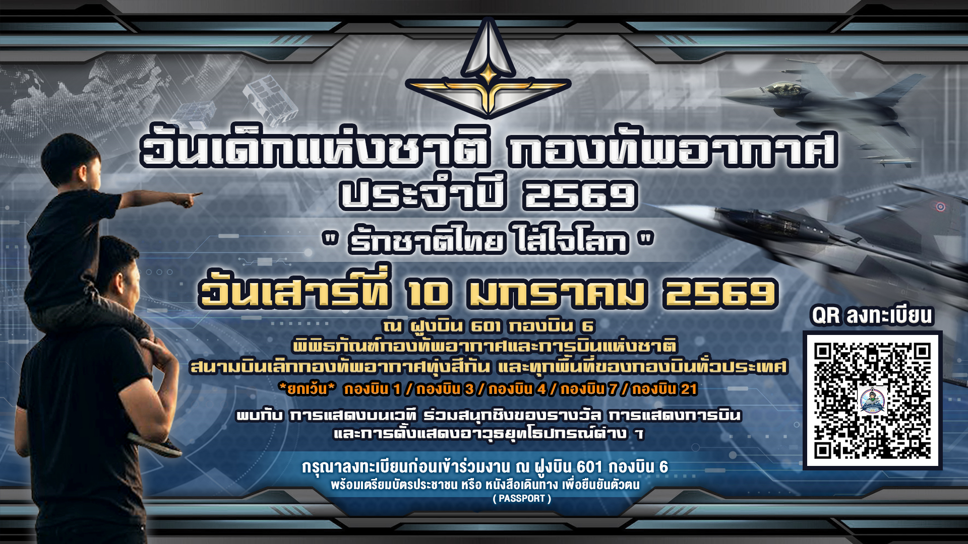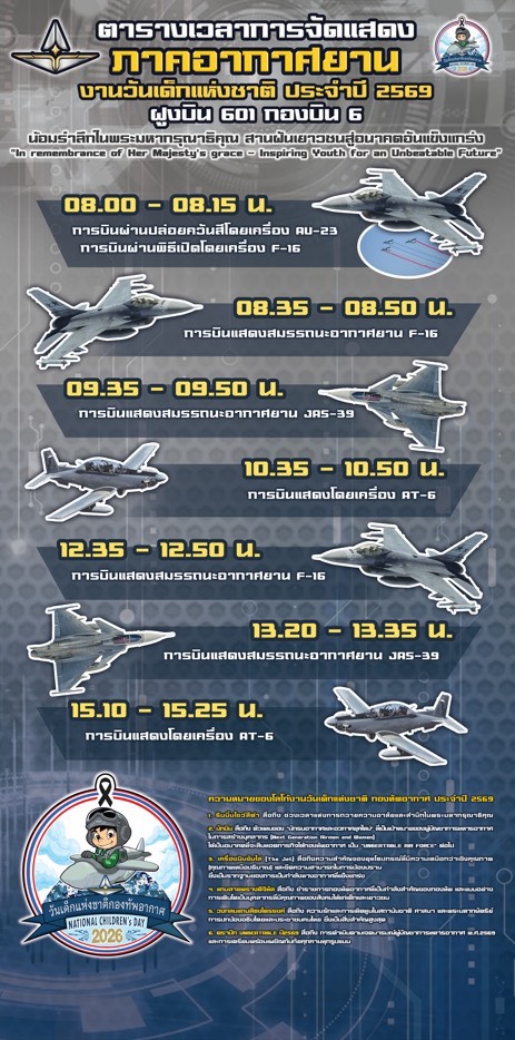 กองทัพอากาศไทย ขอเชิญชวนน้อง ๆ หนู ๆ และผู้ปกครอง มาร่วมเปิดโลกการเรียนรู้ สร้างแรงบันดาลใจ และสัมผัสประสบการณ์สุดตื่นเต้นไปพร้อมกัน วันเสาร์ที่ 10 มกราคม 2569 เวลา 07.00 – 16.00 น.