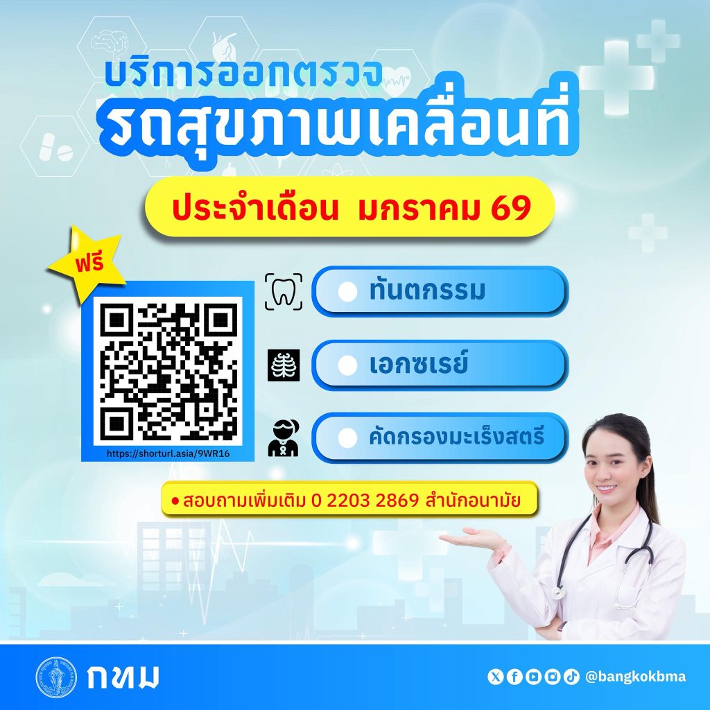 กรุงเทพมหานคร บริการออกตรวจรถสุขภาพเคลื่อนที่ ประจำเดือน มกราคม 2569 โดยให้บริการ ทันตกรรม เอกซเรย์ คัดกรองมะเร็งสตรี สามารถสแกน QR code หรือ https://shorturl.asia/9WR16 เพื่อดูปฏิทินการให้บริการประจำเดือน มกราคม 2569 สอบถามเพิ่มเติม โทร. 0 2203 2869 สำนักอนามัย กรุงเทพมหานคร