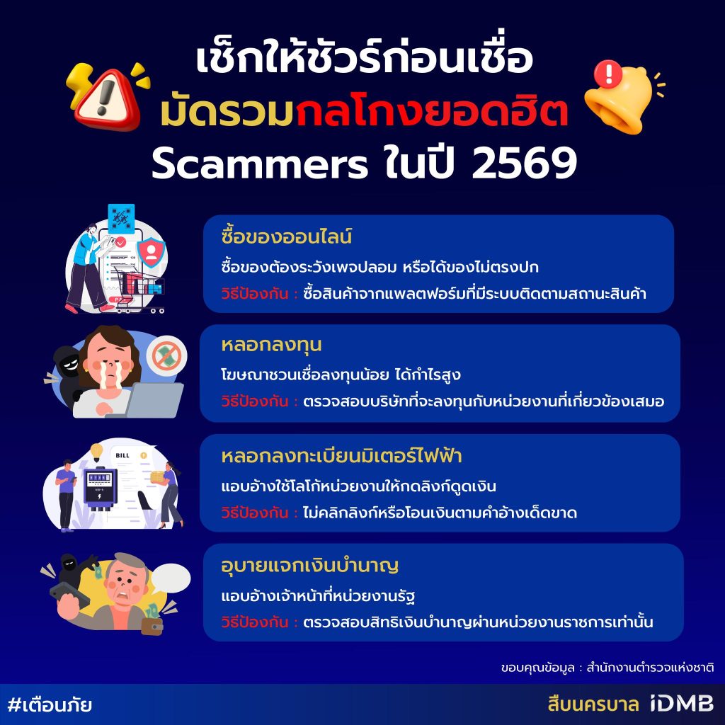 กองบังคับการสืบสวนสอบสวน เตือนกลโกงยอดฮิต Scammers ในปี 2569 ข่าวสารกิจกรรม กองบังคับการสืบสวนสอบสวน เตือนกลโกงยอดฮิต Scammers ในปี 2569 กองบังคับการสืบสวนสอบสวน เตือนกลโกงยอดฮิต Scammers ในปี 2569 โดยในปี พ.ศ. 2569 ที่จะถึงนี้ มิจฉาชีพก็ยังคงตั้งหน้าตั้งตาหลอกลวงเราอย่างต่อเนื่อง ด้วยกลลวงที่ไม่เคยหายไปจากโลกออนไลน์เหล่านี้1. ซื้อของออนไลน์ ต้องระวังเพจปลอม, ได้ของไม่ตรงปกวิธีป้องกัน : ซื้อสินค้าจากแพลตฟอร์มที่มีระบบยืนยันตัวผู้ขาย-ติดตามสถานะสินค้า2. หลอกลงทุน โฆษณาชวนเชื่อ ลงทุนน้อย ได้กำไรสูงวิธีป้องกัน : ตรวจสอบบริษัทที่จะลงทุนกับหน่วยงานที่เกี่ยวข้องเสมอ3. หลอกลงทะเบียนมิเตอร์ไฟฟ้า แอบอ้างใช้โลโก้หน่วยงาน ให้กดลิงก์ดูดเงินวิธีป้องกัน : ไม่คลิกลิงก์หรือโอนเงินตามคำอ้างเด็ดขาด4. อุบายแจกเงินบำนาญ แอบอ้างเจ้าหน้าที่หน่วยงานรัฐวิธีป้องกัน : ตรวจสอบสิทธิเงินบำนาญผ่านหน่วยงานทางการเท่านั้น ที่มา : Fcebook สืบนครบาล IDMB Post Views: 29 FacebookFacebookXTwitterLINELine
