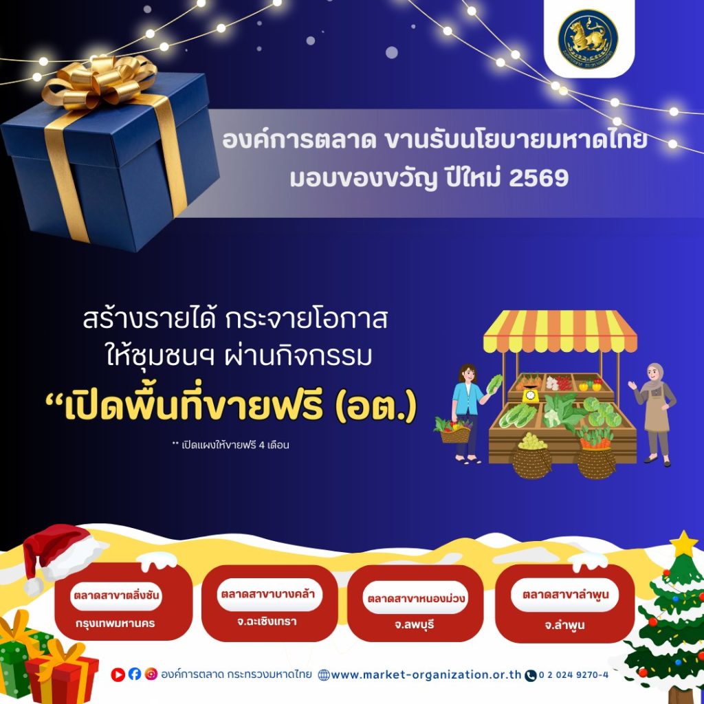 องค์การตลาด มอบของขวัญปีใหม่ 2569 เปิดพื้นที่ขายฟรี 4 เดือน ข่าวสารกิจกรรม, ปีใหม่, เทศกาล องค์การตลาด มอบของขวัญปีใหม่ 2569 เปิดพื้นที่ขายฟรี 4 เดือน องค์การตลาด มอบของขวัญปีใหม่ 2569 ให้ประชาชนผ่านกิจกรรม “เปิดพื้นที่ขายฟรี” นานสูงสุด 4 เดือน เพื่อช่วยลดต้นทุน เพิ่มช่องทางสร้างรายได้ และกระจายโอกาสทางการค้าอย่างทั่วถึง องค์การตลาด ขานรับนโยบายกระทรวงมหาดไทย มอบของขวัญ ปีใหม่ 2569 สร้างรายได้ กระจายโอกาส ให้ชุมชนฯ ผ่านกิจกรรม “เปิดพื้นที่ขายฟรี ” 4 เดือน สอบถามรายละเอียดเพิ่มเติมได้ที่ องค์การตลาด สาขาในพื้นที่ ดังกล่าว หรือ สำนักงานใหญ่ เบอรืติดต่อ 0 2 024 9270-4 และติดตามข้อมูลข่าวสารขององค์การตลาด ได้ที่ Line OA : องค์การตลาด (อต.) และหน้าแฟนเพจ Facebook : องค์การตลาด กระทรวงมหาดไทย ที่มา : Facebook องค์การตลาด กระทรวงมหาดไทย Post Views: 22 FacebookFacebookXTwitterLINELine