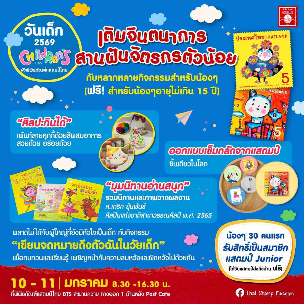 พิพิธภัณฑ์แสตมป์ไทย จัดกิจกรรมวันเด็กแห่งชาติ 2569 “เติมจินตนาการ สานฝันจิตรกรตัวน้อย” วันที่ 10 – 11 มกราคม 2569 เวลา 08.30 – 16.30 น. ณ พิพิธภัณฑ์แสตมป์ไทย