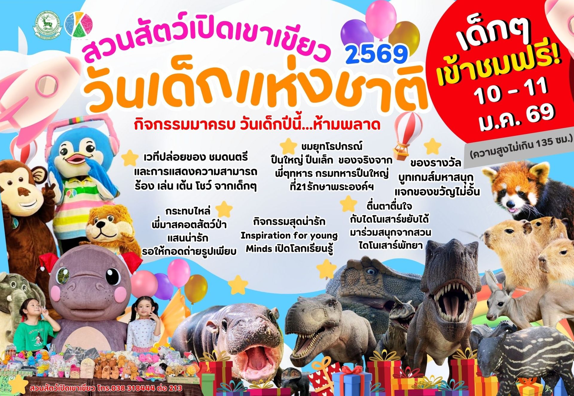 สวนสัตว์เปิดเขาเขียว เปิดให้เด็กเข้าฟรีเนื่องในวันเด็กแห่งชาติ 2569 ในวันที่ 10 – 11 มกราคม 2569 (เด็กความสูงไม่เกิน 135 เซนติเมตร)