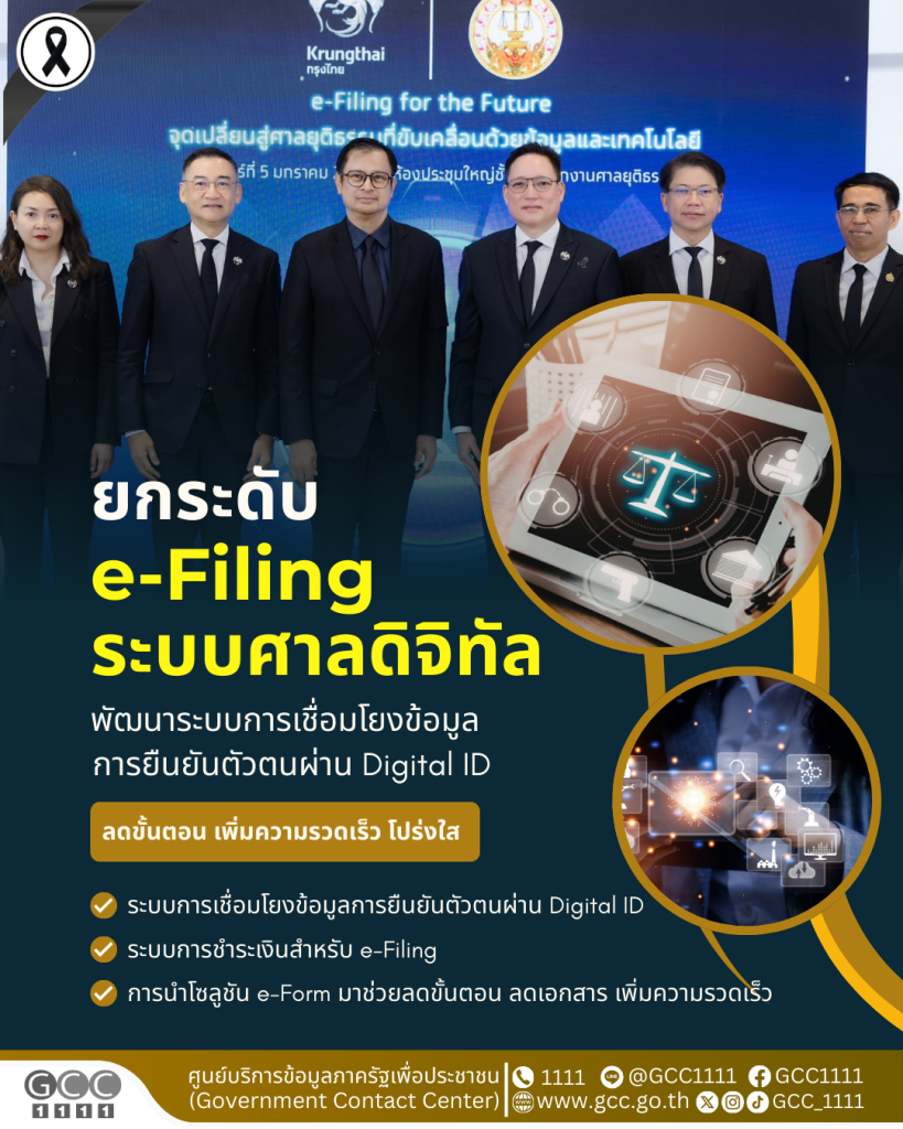 สำนักงานศาลยุติธรรม ร่วมกับ ธนาคารกรุงไทย ยกระดับ e-Filing ระบบศาลดิจิทัล ภายใต้ยุทธศาสตร์ Modern Innovation ยกระดับกระบวนการยุติธรรมด้วยเทคโนโลยี ลดขั้นตอน เพิ่มความรวดเร็ว โปร่งใส และเปิดโอกาสให้ประชาชนเข้าถึงความยุติธรรมได้อย่างเท่าเทียม พร้อมเดินหน้าสู่ “ศาลดิจิทัล” อย่างเป็นรูปธรรม