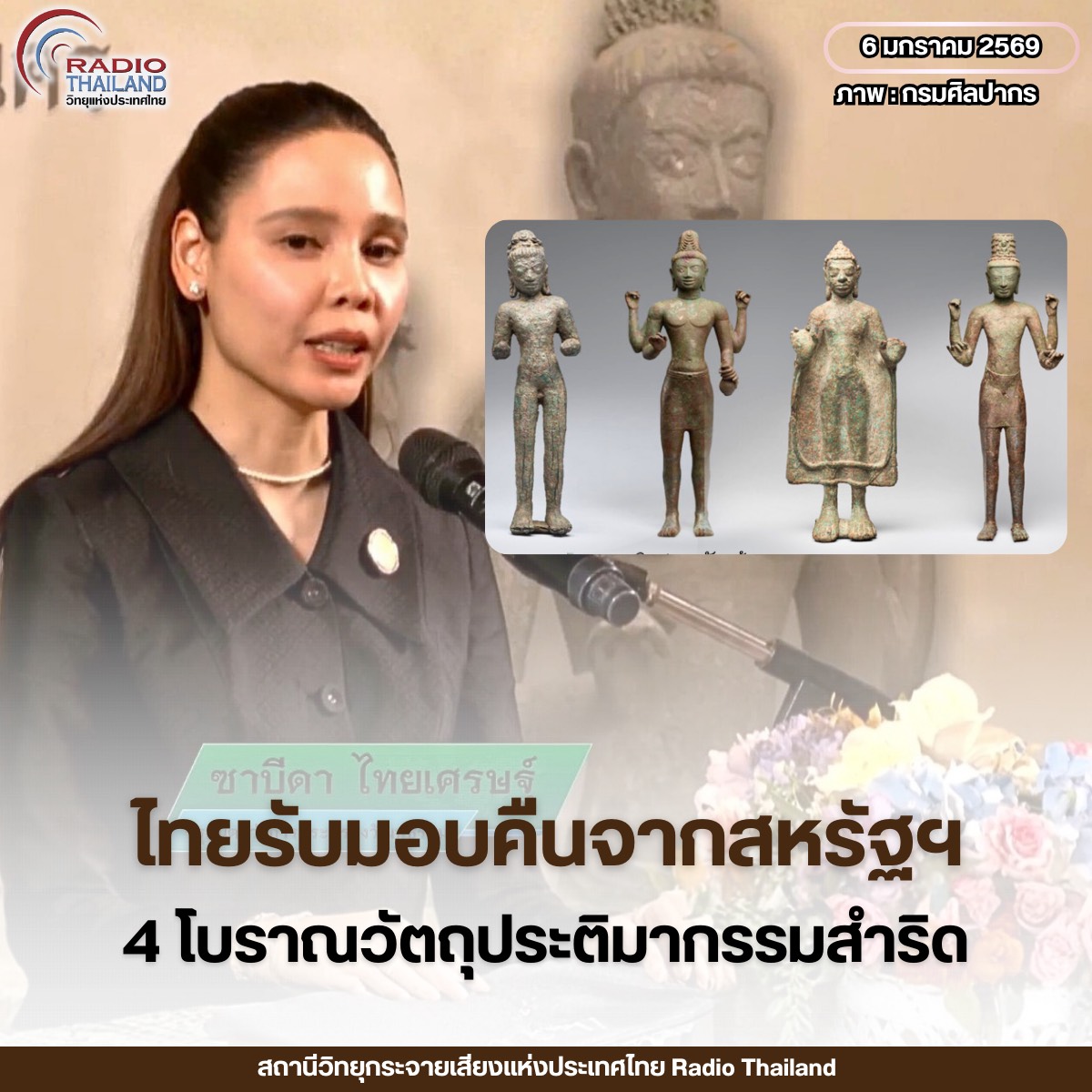 (6 ม.ค.69) นางสาวซาบีดา ไทยเศรษฐ์ รัฐมนตรีว่าการกระทรวงวัฒนธรรม เป็นประธานรับมอบโบราณวัตถุประติมากรรมสำริดกลุ่มประโคนชัย 4 รายการจากพิพิธภัณฑ์ศิลปะเอเชีย ซานฟรานซิสโก ประเทศสหรัฐอเมริกากลับคืนสู่มาตุภูมิ ที่พระที่นั่งอิศราวินิจฉัย พิพิธภัณฑสถานแห่งชาติ พระนคร โดยได้ กล่าวขอบคุณทางการสหรัฐฯที่ให้ความสำคัญกับปกป้องมรดกทางศิลปวัฒนธรรมของไทยซึ่งโบราณวัตถุดังกล่าวมีความสำคัญทางประวัติศาสตร์และโบราณคดีที่ประเมินค่ามิได้ยืนยันถึงการมีอยู่ของเมืองศรีจนาศะ เมืองโบราณที่มีศูนย์กลางอยู่บริเวณลุ่มแม่น้ำมูลและที่ราบสูงโคราช ความศรัทธาในพุทธศาสนา และภูมิปัญญาด้านโลหกรรมขั้นสูง ถือเป็นความสำเร็จของหน่วยงานที่เกี่ยวข้องที่ร่วมกันทำงานมาตั้งแต่ปี 2561