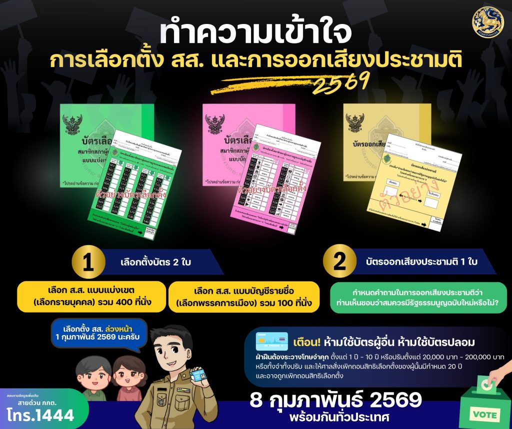 กรมการปกครอง แนะนำทำความเข้าใจ การเลือกตั้ง สส. และการออกเสียงประชามติ 2569 ข่าวสารกิจกรรม กรมการปกครอง แนะนำทำความเข้าใจ การเลือกตั้ง สส. และการออกเสียงประชามติ 2569 กรมการปกครอง แนะนำทำความเข้าใจ การเลือกตั้ง สมาชิกสภาผู้แทนราษฎร และการออกเสียงประชามติ 2569 บัตร 3 ใบประกอบด้วยอะไรบ้างเลือกตั้งบัตร 2 ใบสีเขียวเลือก ส.ส. แบบแบ่งเขต (เลือกรายบุคคล) รวม 400 ที่นั่งสีชมพูเลือก ส.ส. แบบบัญชีรายชื่อ(เลือกพรรคการเมือง) รวม 100 ที่นั่งบัตรออกเสียงประชามติ 1 ใบสีเหลืองกำหนดคำถามในการออกเสียงประชามติว่า ท่านเห็นชอบว่าสมควรมีรัฐธรรมนูญฉบับใหม่หรือไม่ เตือน ห้ามใช้บัตรผู้อื่น ห้ามใช้บัตรปลอม ฝ่าฝืนต้องระวางโทษจำคุก ตั้งแต่ 1 ปี – 10 ปี หรือปรับตั้งแต่ 20,000 บาท – 200,000 บาท หรือทั้งจำทั้งปรับ และให้ศาลสั่งเพิกถอนสิทธิเลือกตั้งของผู้นั้นมีกำหนด 20 ปี และอาจถูกเพิกถอนสิทธิเลือกตั้งเลือกพร้อมกัน 8 กุมภาพันธ์ 2569 ทั่วประเทศเลือกตั้ง สส. ล่วงหน้า 1 กุมภาพันธ์ 2569 นะครับ ที่มา : Facebook : กรมการปกครอง Post Views: 64 FacebookFacebookXTwitterLINELine