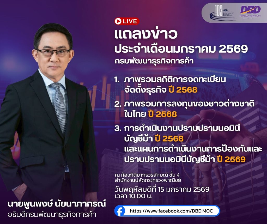 ขอเชิญชวนทุกท่านร่วมรับชม Live แถลงข่าวประจำเดือนมกราคม 2569 กรมพัฒนาธุรกิจการค้า