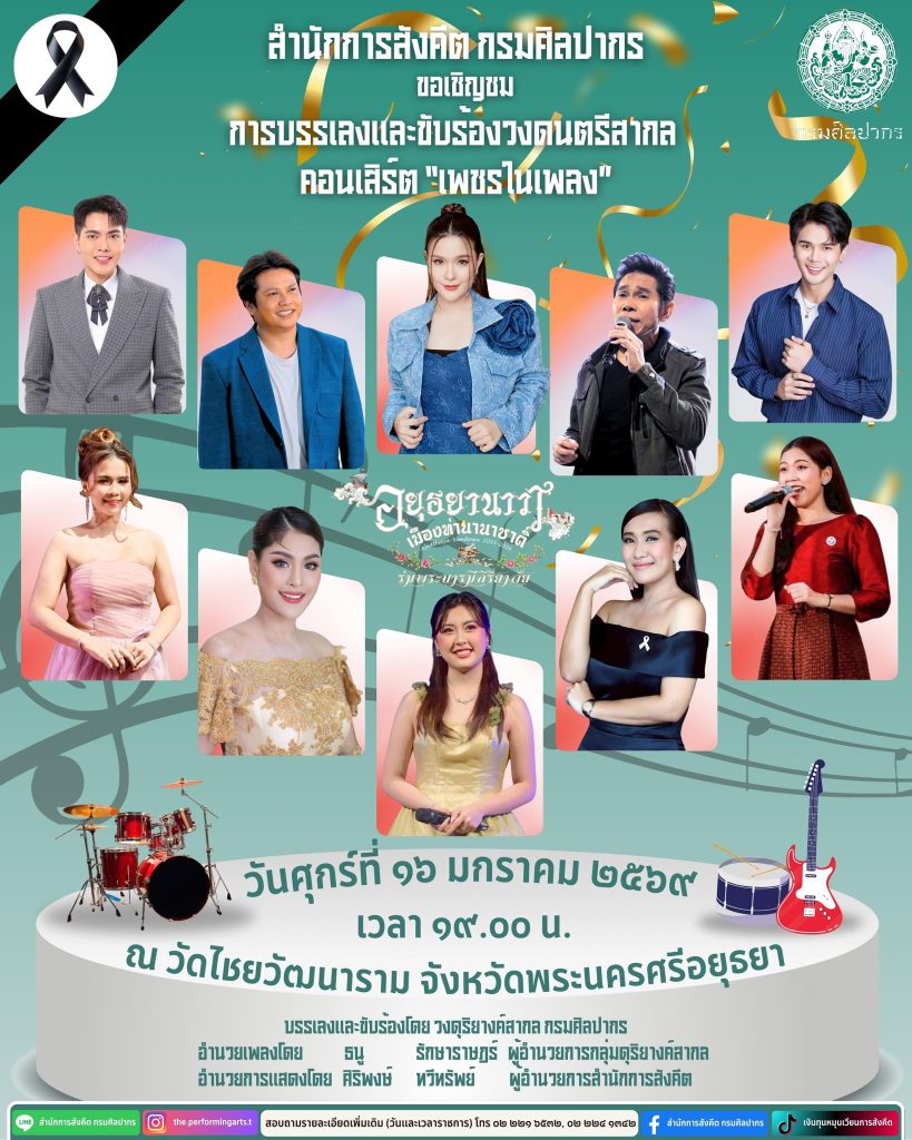 กรมศิลปากร ขอเชิญชม การบรรเลงและขับร้องวงดนตรีสากล คอนเสิร์ต เพชรในเพลง เนื่องในงาน อยุธยานาวา เมืองท่านานาชาติ ร่มพระบารมีสิริยาลัย วันที่ 16 มกราคม 2569 เวลา 19.00 น. ณ วัดไชยวัฒนาราม จังหวัดพระนครศรีอยุธยา