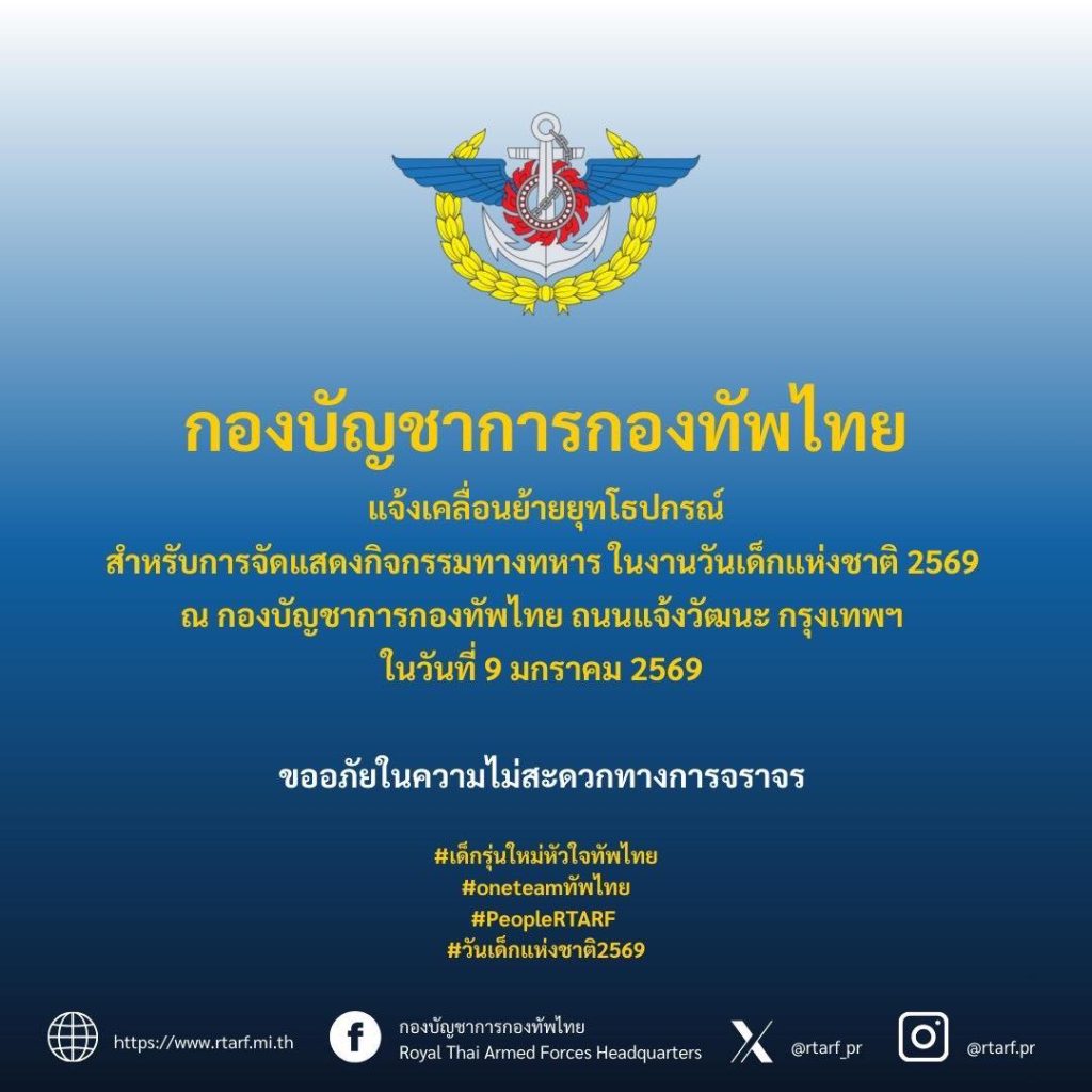 กองบัญชาการกองทัพไทย แจ้งเคลื่อนย้ายยุทโธปกรณ์ สำหรับกิจกรรมของทหารในงานวันเด็กแห่งชาติ ประจำปี 2569 ณ กองบัญชาการกองทัพไทย ถนนแจ้งวัฒนะ กรุงเทพฯ ในวันศุกร์ที่ 9 มกราคม 2569