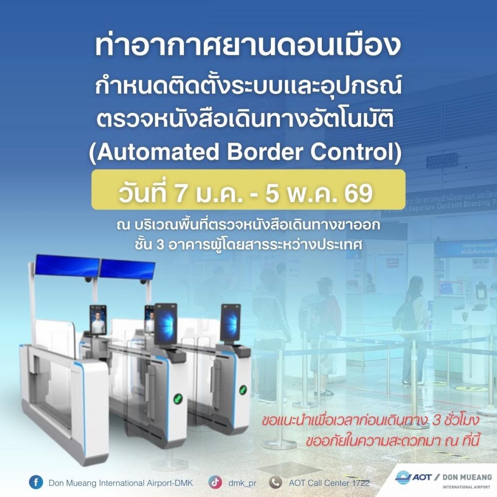 ท่าอากาศยานดอนเมือง แจ้งปิดพื้นที่บางส่วน ติดตั้งระบบตรวจหนังสือเดินทางอัตโนมัติกำหนดการติดตั้งระบบและอุปกรณ์ตรวจหนังสือเดินทางอัตโนมัติ (Automated Border Control) จำนวน 31 ชุด เพื่อเพิ่มประสิทธิภาพการให้บริการที่ทันสมัย รวดเร็ว และลดความแออัดของผู้โดยสาร ตั้งแต่วันที่ 7 มกราคม – 5 พฤษภาคม 2569 บริเวณพื้นที่ตรวจหนังสือเดินทางขาออก ชั้น 3 อาคารผู้โดยสารระหว่างประเทศ (อาคาร 1) ซึ่งจะมีการปิดพื้นที่บางส่วนชั่วคราว โดยเมื่อติดตั้งแล้วเสร็จจะทยอยเปิดให้บริการเครื่อง Automated Border Control ได้ทันที