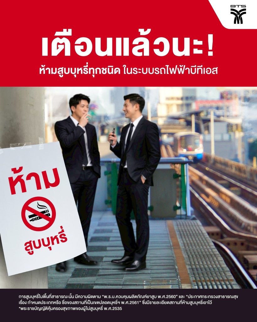 รถไฟฟ้าบีทีเอส เตือน ห้ามสูบบุหรี่ทุกชนิด ในระบบรถไฟฟ้าบีทีเอส