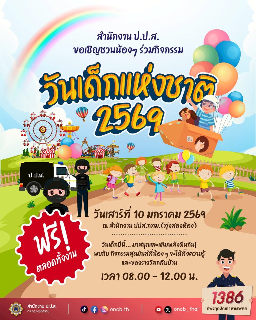 สำนักงานคณะกรรมการป้องกันและปราบปรามยาเสพติด จัดกิจกรรม วันเด็กแห่งชาติ 2569 ในวันที่ 10 มกราคม 2569 เวลา 08.00 – 12.00 น. ณ สำนักงาน ปปส.กทม. (ทุ่งสองห้อง)