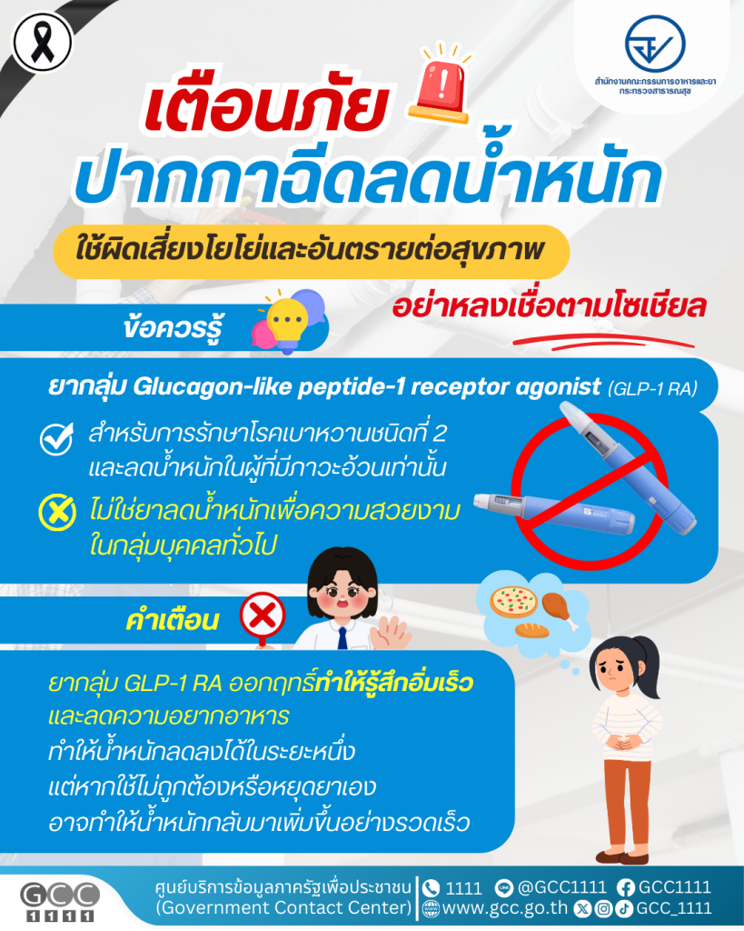 เภสัชกรหญิงสุภัทรา บุญเสริม เลขาธิการคณะกรรมการอาหารและยา เปิดเผยว่า จากกรณีพบการใช้ “ปากกาฉีดลดน้ำหนัก” ตามโซเชียลมีเดียอย่างแพร่หลาย โดยเฉพาะในกลุ่มคนทั่วไปรวมถึงมีการปรับขนาดยาและวิธีการฉีดด้วยตนเอง สำนักงานคณะกรรมการอาหารและยา (อย.) มีความห่วงใยอย่างยิ่ง ขอเรียนว่า ในประเทศไทยอนุมัติยากลุ่ม Glucagon-like peptide-1 receptor agonist (GLP-1 RA) สำหรับการรักษาโรคเบาหวานชนิดที่ 2 และลดน้ำหนักในผู้ที่มีภาวะอ้วนเท่านั้น ไม่ใช่ยาลดน้ำหนักเพื่อความสวยงามในกลุ่มบุคคลทั่วไป โดยยากลุ่ม GLP-1 RA ออกฤทธิ์ทำให้รู้สึกอิ่มเร็วและลดความอยากอาหาร ทำให้น้ำหนักลดลงได้ในระยะหนึ่ง แต่หากใช้ไม่ถูกต้องหรือหยุดยาเองโดยไม่มีการควบคุม อาจทำให้น้ำหนักดีดกลบเพิ่มขึ้นอย่างรวดเร็ว หรือที่เรียกว่า โยโย่ และเสี่ยงเกิดผลข้างเคียงรุนแรง เช่น น้ำตาลในเลือดต่ำ ไตวาย ถุงน้ำดีอักเสบ ภาวะซึมเศร้า หรือกล้ามเนื้อฝ่อลีบ โดยเฉพาะในผู้ที่มีโรคประจำตัว เช่น โรคไต โรคตับ โรคไทรอยด์ หรือโรคต่อมไร้ท่อ ซึ่งจำเป็นต้องได้รับการประเมินและดูแลอย่างใกล้ชิดจากแพทย์