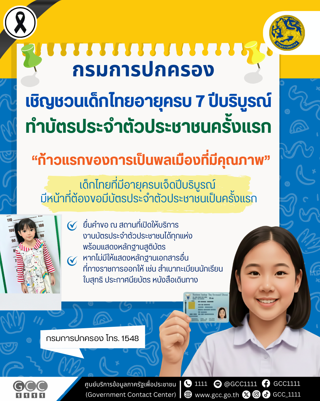 กรมการปกครอง เชิญชวนเด็กอายุครบ 7 ปีบริบูรณ์ ทําบัตรประจําตัวประชาชนครั้งแรก เพื่อเป็นตัวอย่างเด็กดี 10 มกราคม วันเด็กแห่งชาติ ประจำปี 2569 ก้าวแรกของการเป็นพลเมืองที่มีคุณภาพ “เด็กไทยที่มีอายุครบเจ็ดปีบริบูรณ์ มีหน้าที่ต้องขอมีบัตรประจำตัวประชาชนเป็นครั้งแรก” สามารถยื่นคำขอ ณ สถานที่ที่เปิดให้บริการงานบัตรประจำตัวประชาชนได้ทุกแห่ง พร้อมแสดงหลักฐานสูติบัตร หากไม่มีให้แสดงหลักฐานเอกสารอื่นที่ทางราชการออกให้ เช่น สำเนาทะเบียนนักเรียน ใบสุทธิ ประกาศนียบัตร หนังสือเดินทาง เป็นต้น