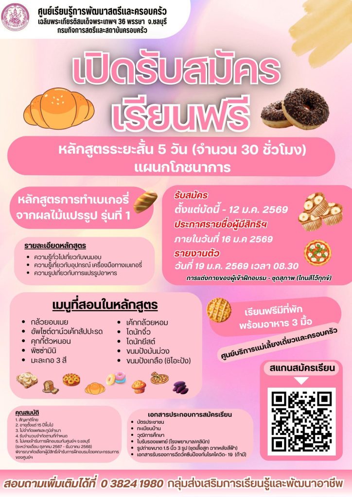 กรมกิจการสตรีและสถาบันครอบครัว เปิดรับสมัคร แผนกโภชนาการ หลักสูตรการทำเบเกอรี่จากผลไม้แปรรูป รุ่นที่ 1 (รับจำนวน 25 คน/รุ่น) เปิดรับสมัครเรียนฟรี ไม่มีค่าใช้จ่าย