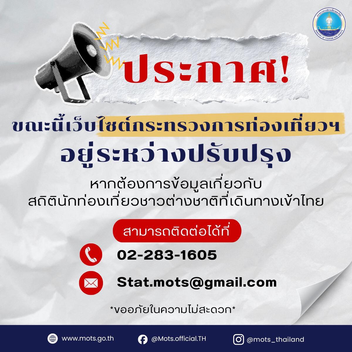 กระทรวงการท่องเที่ยวและกีฬา แจ้งปรับปรุงเว็บไซต์ หากต้องการข้อมูลสถิตินักท่องเที่ยวชาวต่างชาติที่เดินทางเข้าไทย สามารถติดต่อได้ที่ อีเมล์ Stat.mots@gmail.com หรือ โทร 0 2283 1605