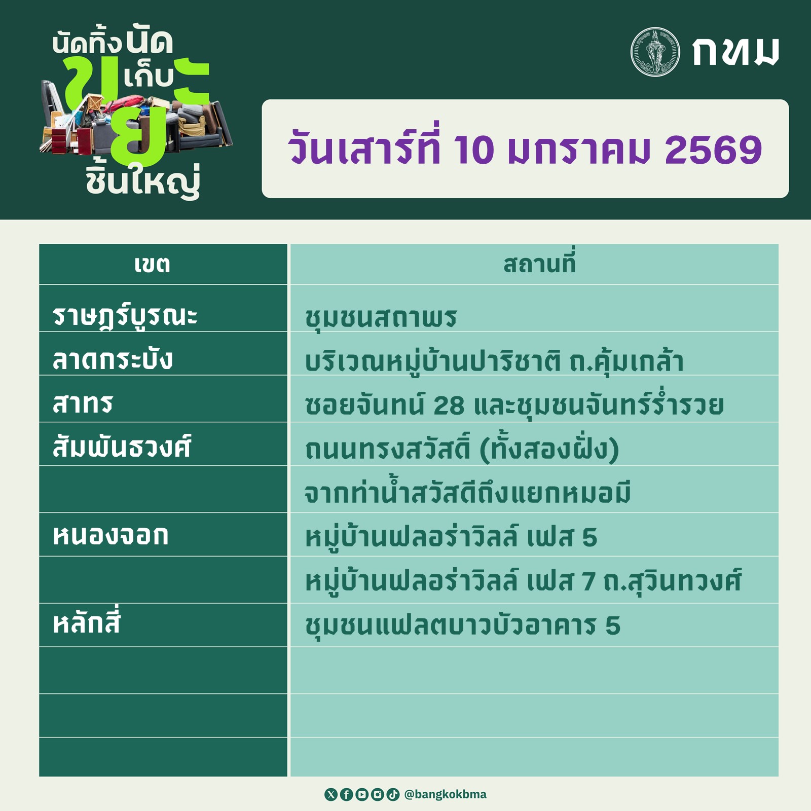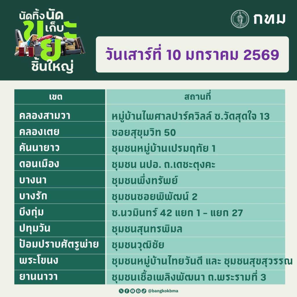 กรุงเทพมหานคร นัดทิ้ง นัดเก็บ ขยะชิ้นใหญ่ ในวันเสาร์ที่ 10 มกราคม 2569 และวันอาทิตย์ที่ 11 มกราคม 2569 ตั้งแต่เวลา 09.00 – 12.00 น. ทุกสำนักงานเขตให้บริการฟรี โดยไม่มีค่าใช้จ่าย ขอความร่วมมือนำขยะชิ้นใหญ่และสิ่งของเหลือใช้ออกมาทิ้ง ณ บริเวณจุดพักขยะหน้าบ้านพักอาศัยก่อนเวลา 08.30 น.
