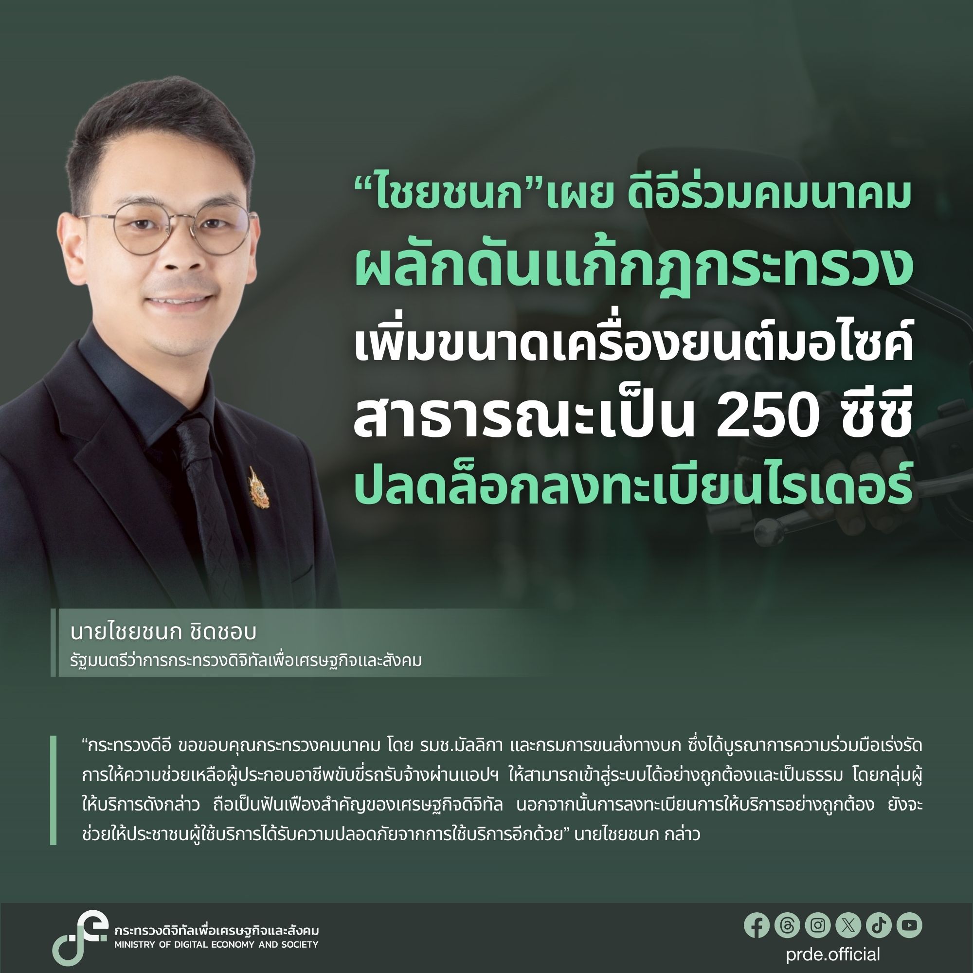 นายไชยชนก ชิดชอบ รัฐมนตรีว่าการกระทรวงดิจิทัลเพื่อเศรษฐกิจและสังคม (ดีอี) เปิดเผยว่า ตามที่กระทรวงดีอี โดยสำนักงานพัฒนาธุรกรรมทางอิเล็กทรอนิกส์ (สพธอ.) หรือ ETDA ได้ร่วมกับนางสาวมัลลิกา จิระพันธุ์วาณิช รัฐมนตรีช่วยว่าการกระทรวงคมนาคม โดยกรมการขนส่งทางบก ผลักดันมาตรการช่วยเหลือไรเดอร์และไดรเวอร์ทั่วประเทศ เพื่อแก้ไขผลกระทบจากการนำรถยนต์หรือรถจักรยานยนต์ไปจดทะเบียนเป็น รถรับจ้างสาธารณะ รย.17 (รถจักรยานยนต์) หรือ รย.18 (รถยนต์) ในการให้บริการผ่านแอปพลิเคชัน
