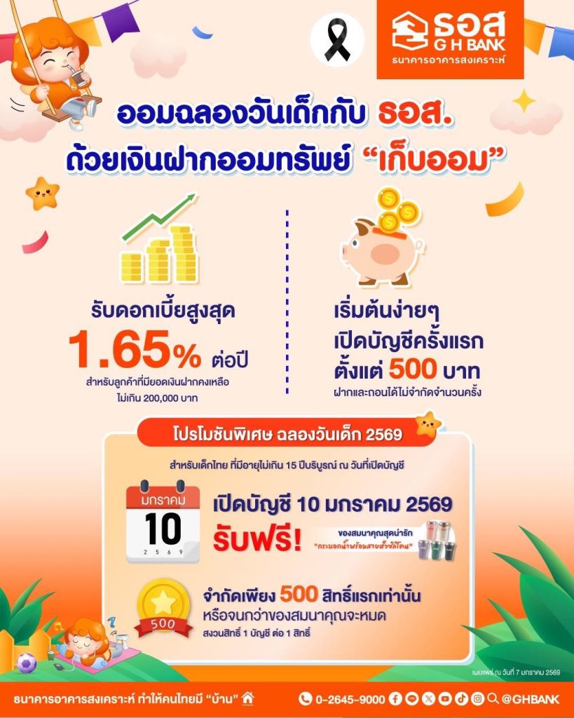 ธนาคารอาคารสงเคราะห์ (ธอส.) ร่วมส่งเสริมวินัยการออมเนื่องในเทศกาลวันเด็กแห่งชาติ ประจำปี 2569 สำหรับเด็กไทยที่มีอายุไม่เกิน 15 ปีบริบูรณ์ ออมเงินกับเงินฝากออมทรัพย์ “เก็บออม” จะได้รับผลตอบแทนจากอัตราดอกเบี้ยสูงถึง 1.65% ต่อปี (สำหรับลูกค้าที่มียอดเงินฝากคงเหลือไม่เกิน 200,000 บาท) โดยเปิดบัญชีครั้งแรกตั้งแต่ 500 บาทขึ้นไป พร้อมสิทธิพิเศษเฉพาะผู้เปิดบัญชีในวันเสาร์ที่ 10 มกราคม 2569 รับฟรีกระบอกน้ำพร้อมสายหิ้วซิลิโคนสุดน่ารักจำนวน 500 สิทธิ์ (1 บัญชี ต่อ 1 สิทธิ์) หรือจนกว่าของสมนาคุณจะหมด (เงื่อนไขเป็นไปตามที่ธนาคารกำหนด) โดยผู้ปกครองพาน้อง ๆ มาสร้างอนาคตทางการเงินที่มั่นคงไปกับ ธอส. ได้ง่าย ๆ ซึ่งผู้ฝากสามารถฝากและถอนได้ไม่จำกัดจำนวนครั้ง และจะได้รับดอกเบี้ยเงินฝากปีละ 2 ครั้ง ในวันที่ 29 มิถุนายน และ วันที่ 29 ธันวาคม สอบถามรายละเอียดเพิ่มเติมได้ที่ G H Bank Call Center โทร. 0 2645 9000 และติดตามข่าวสารของธนาคารได้ที่ G H Bank Social Media ทุกช่องทาง