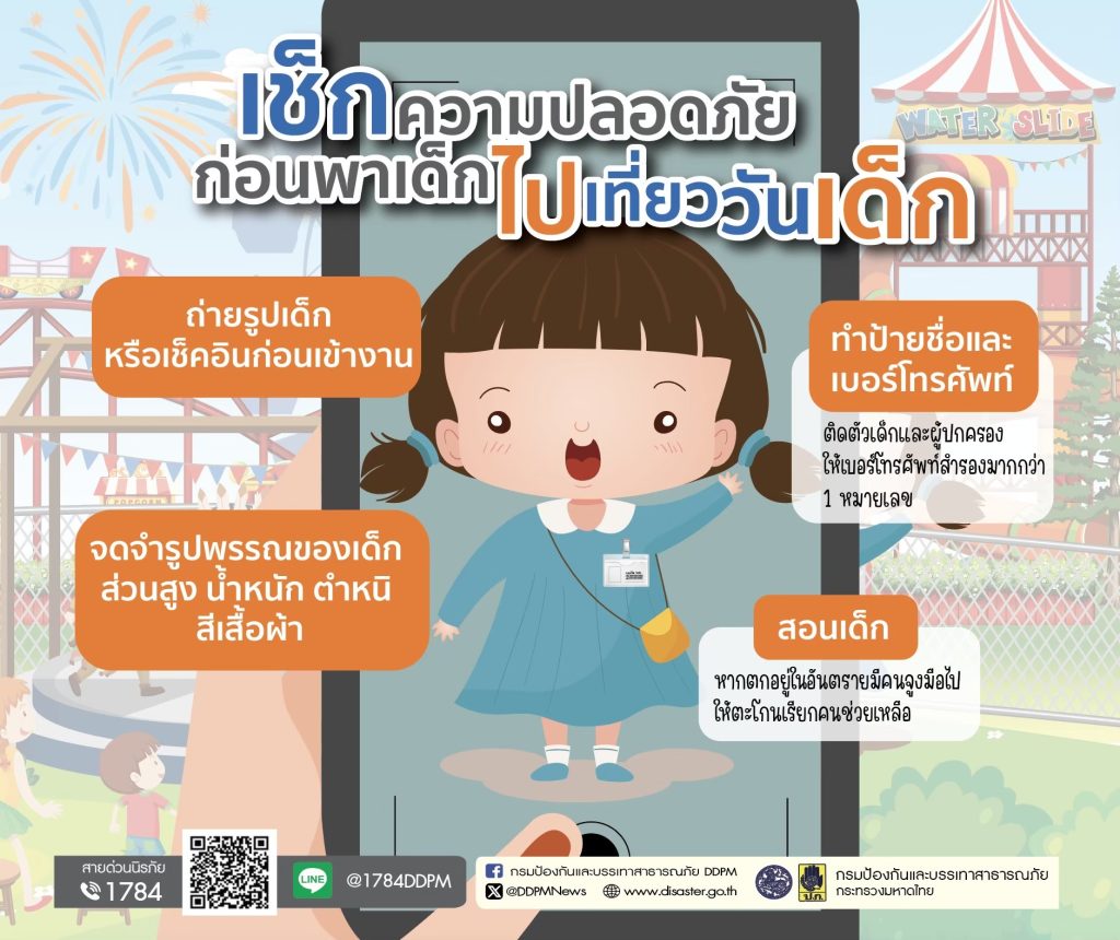นายธีรพัฒน์ คัชมาตย์ อธิบดีกรมป้องกันและบรรเทาสาธารณภัย (ปภ.) เปิดเผยว่า วันเสาร์ที่สองของเดือนมกราคมของทุกปี ได้กำหนดให้เป็นวันเด็กแห่งชาติ ซึ่งปีนี้ตรงกับวันเสาร์ที่ 10 มกราคม 2569 ซึ่งหลายพื้นที่จะมีการจัดกิจกรรมต่างๆ มากมาย และจะมีเด็กๆ เข้าร่วมเป็นจำนวนมาก หากขาดความระมัดระวังอาจเกิดเหตุไม่คาดคิดขึ้น เพื่อความปลอดภัยกรมป้องกันและบรรเทาสาธารณภัย ขอแนะให้ผู้ปกครองพาลูกเที่ยวงานวันเด็กอย่างปลอดภัย ดังนี้ ผู้ปกครองควรเตรียมความพร้อม โดยถ่ายรูปเด็กเก็บไว้หรือจดจำลักษณะเสื้อผ้าและรูปร่างของเด็ก เขียนชื่อ–นามสกุล และหมายเลขโทรศัพท์ผู้ปกครองใส่ไว้ในกระเป๋าของเด็ก พร้อมสอนให้เด็กท่องจำเบอร์โทรศัพท์ของผู้ปกครองที่สามารถติดต่อได้ และกำหนดจุดนัดพบในกรณีเกิดเหตุฉุกเฉิน เมื่อถึงสถานที่จัดงานให้เช็คอินก่อนเข้างาน พร้อมสอนให้เด็กรู้จักขอความช่วยเหลือจากเจ้าหน้าที่หรือผู้พบเห็นจะได้พาเด็กส่งให้ผู้ปกครองได้อย่างปลอดภัย โดยเฉพาะบริเวณที่มีความเสี่ยง เช่น ริมถนน ริมน้ำ หรือพื้นที่แออัด ผู้ปกครองควรให้เด็กจูงมือตลอดเวลา หลีกเลี่ยงกิจกรรมที่อาจก่อให้เกิดอันตราย เพราะอาจเกิดอุบัติเหตุไม่คาดคิดได้ ควรเลือกเครื่องเล่นและกิจกรรมที่เหมาะสมและให้เด็กปฏิบัติตามคำแนะนำของเจ้าหน้าที่อย่างเคร่งครัด หากพาเด็กไปสวนสนุก สวนสัตว์ หรือสวนน้ำ ไม่ควรปล่อยเด็กไว้ตามลำพังโดยเด็ดขาด เพื่อให้เด็กได้สนุกกับกิจกรรมในวันเด็กอย่างปลอดภัย ทั้งนี้ หากประชาชนได้รับความเดือดร้อนหรือประสบพบอุบัติเหตุและอุบัติภัยสามารถแจ้งเหตุและขอความช่วยเหลือทางไลน์ “ปภ.รับแจ้งเหตุ 1784” โดยเพิ่มเพื่อน Line ID @1784DDPM รวมถึงสายด่วนนิรภัย 1784 ตลอด 24 ชั่วโมง เพื่อประสานให้การช่วยเหลือโดยด่วนต่อไป