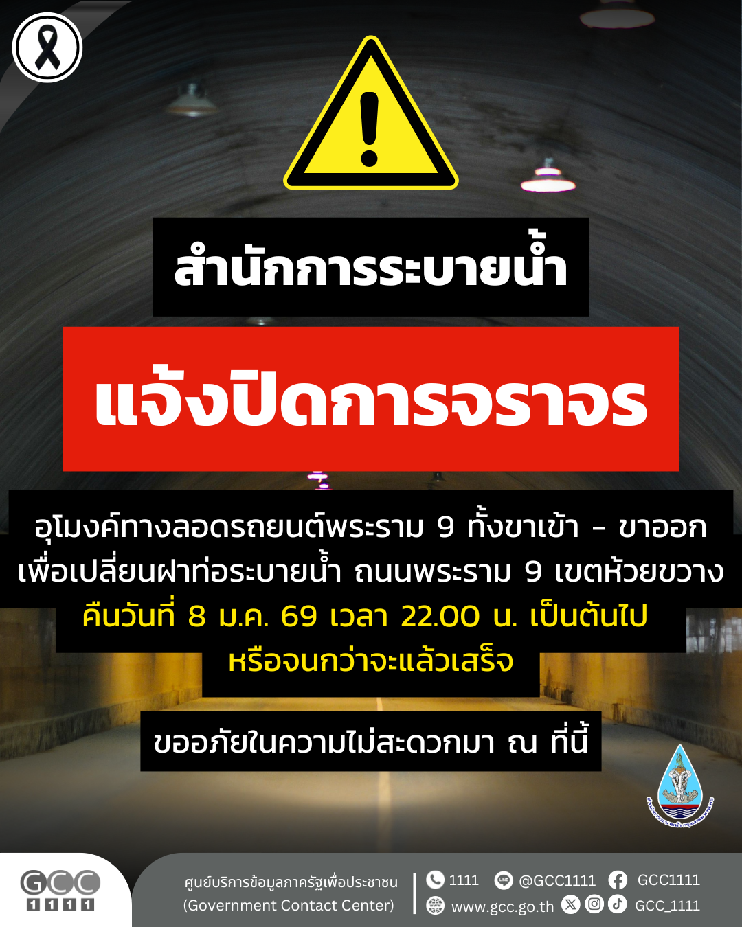 สำนักการระบายน้ำ จะทำการเปลี่ยนฝาท่อระบายน้ำ ถ.พระราม 9 เขตห้วยขวาง จะทำการปิดการจราจร อุโมงค์ทางลอดรถยนต์พระราม 9 ขาเข้าและขาออก คืนวันที่ 8 มกราคม 2569 เวลา 22.00 น.- จนกว่าจะแล้วเสร็จ