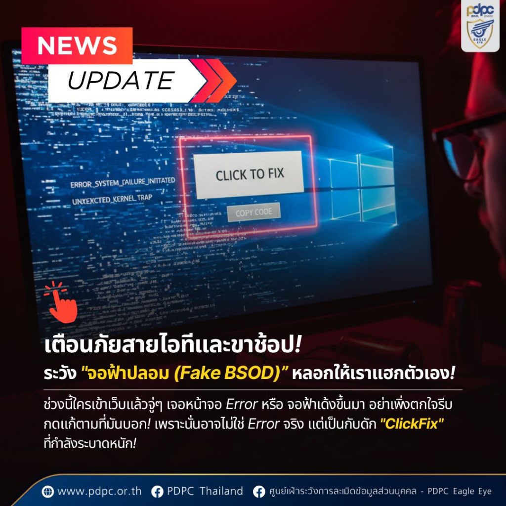 ศูนย์เฝ้าระวังการละเมิดข้อมูลส่วนบุคคล เตือนผู้ใช้งานไอทีและนักช้อปออนไลน์ ระวังการโจมตีทางไซเบอร์รูปแบบใหม่ “ClickFix” ซึ่งใช้หน้าเว็บไซต์หรือจอฟ้า (BSOD) ปลอม หลอกให้ผู้ใช้คัดลอก – วางคำสั่งอันตรายลงในระบบด้วยตนเอง ส่งผลให้เครื่องติดมัลแวร์ ถูกขโมยข้อมูล หรือถูกควบคุมจากระยะไกลได้