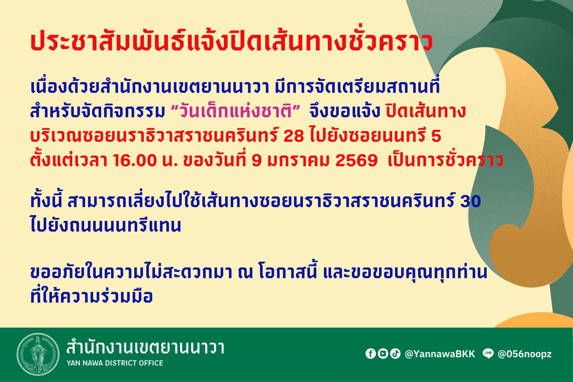 สำนักงานเขตยานนาวา แจ้งปิดเส้นทางบริเวณซอยนราธิวาสราชนครินทร์ 28 ไปยังซอยนนทรี 5 เป็นการชั่วคราว ตั้งแต่เวลา 16.00 น. ของวันที่ 9 มกราคม 2569 เพื่อเตรียมสถานที่สำหรับจัดกิจกรรม “วันเด็กแห่งชาติ”