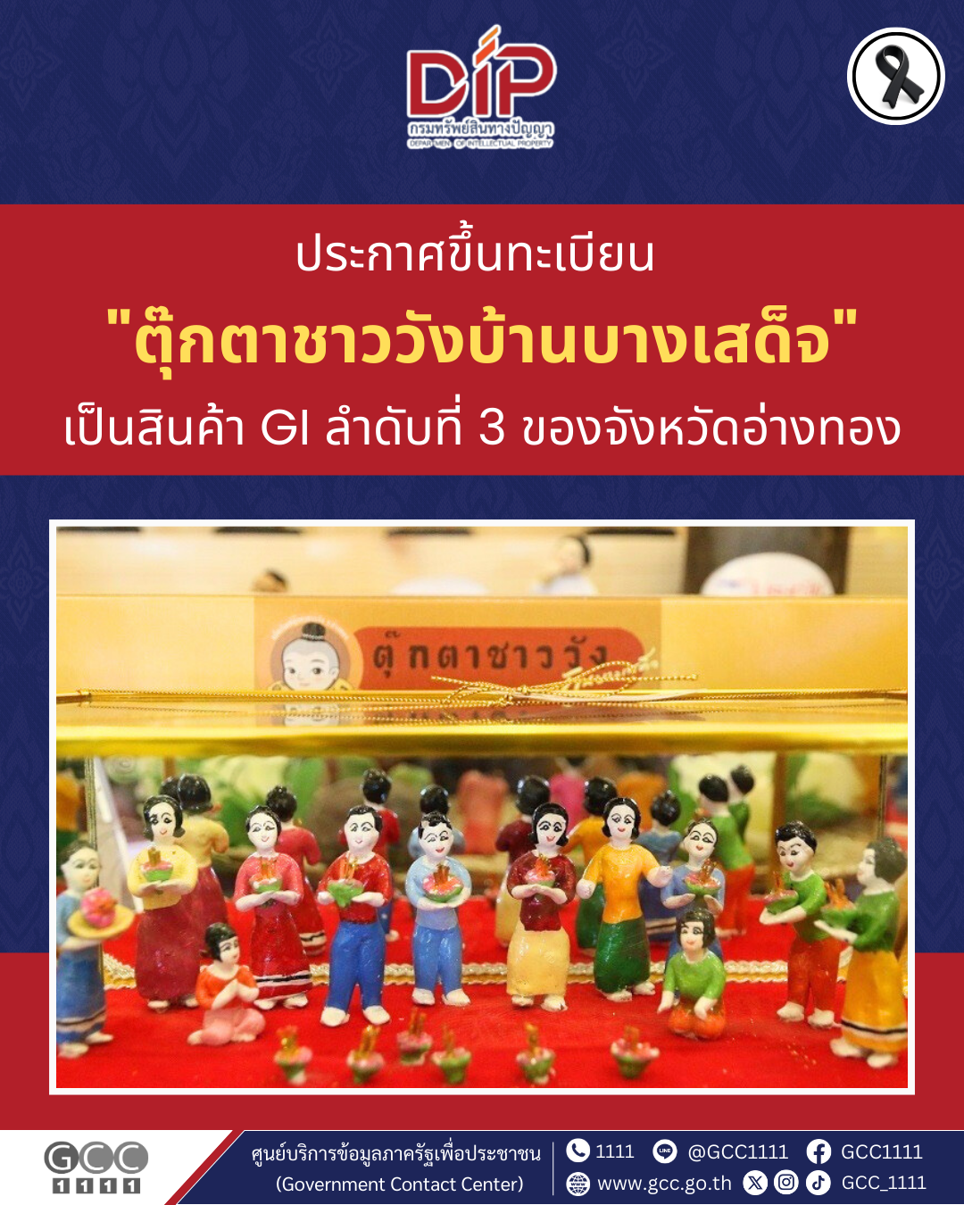กรมทรัพย์สินทางปัญญา ประกาศขึ้นทะเบียนสิ่งบ่งชี้ทางภูมิศาสตร์ (GI) รายการใหม่ “ตุ๊กตาชาววังบ้านบางเสด็จ” ของดีจังหวัดอ่างทอง อัตลักษณ์งานหัตถศิลป์ที่ถือกำเนิดจากพระมหากรุณาธิคุณของพระบรมวงศานุวงศ์ เปลี่ยนดินเหนียวจากท้องนาให้กลายเป็นงานศิลป์สร้างรายได้ ย้ำจุดเด่นการปั้นที่พิถีพิถัน สะท้อนวิถีชีวิตและภูมิปัญญาไทยดั้งเดิม พร้อมยกระดับสู่สินค้าเศรษฐกิจสร้างสรรค์ด้านงานประณีตศิลป์สร้างชื่อเสียงให้กับท้องถิ่นในระดับสากล