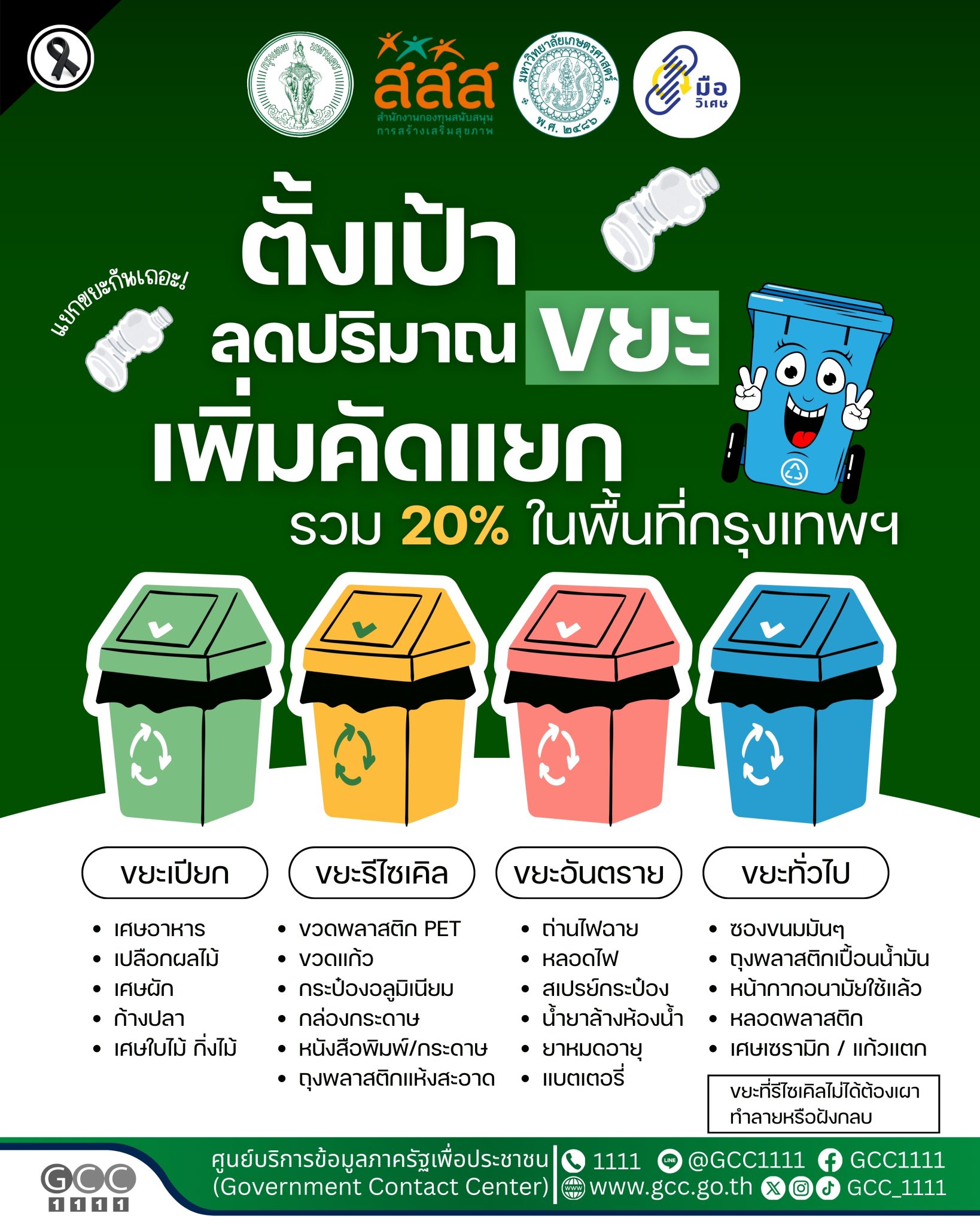 กรุงเทพมหานคร ร่วมกับ มหาวิทยาลัยเกษตรศาสตร์ และ ภาคีเครือข่ายมือวิเศษกรุงเทพภายใต้การสนับสนุนจาก สำนักงานกองทุนสนับสนุนการสร้างเสริมสุขภาพ (สสส.) ขับเคลื่อนโครงการ “บ้านนี้ไม่เทรวม : แยกขยะลดค่าธรรมเนียม”