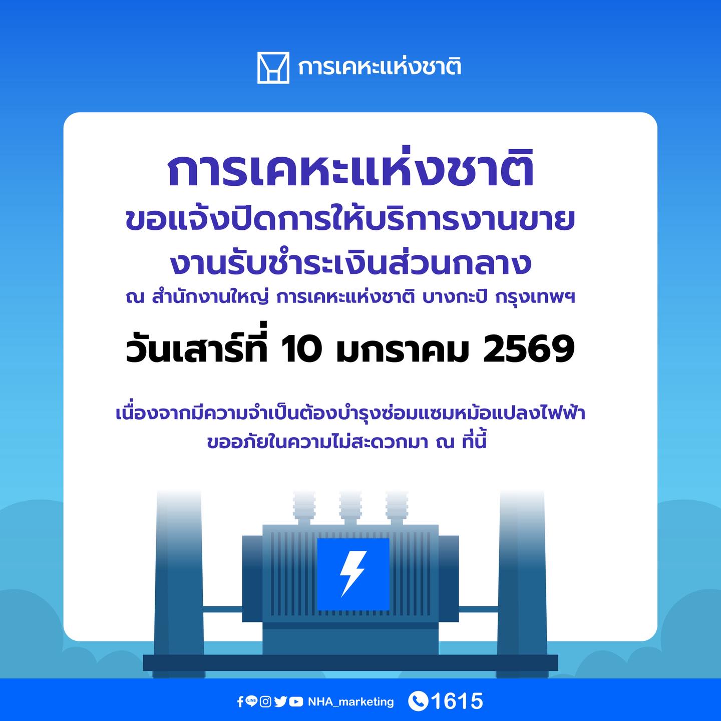 การเคหะแห่งชาติ แจ้งปิดการให้บริการงานขาย งานรับชำระเงินส่วนกลาง ณ สำนักงานใหญ่ การเคหะแห่งชาติ บางกะปิ กรุงเทพฯ ในวันเสาร์ที่ 10 มกราคม 2569 เนื่องจากมีความจำเป็นต้องบำรุงซ่อมแซมหม้อแปลงไฟฟ้า
