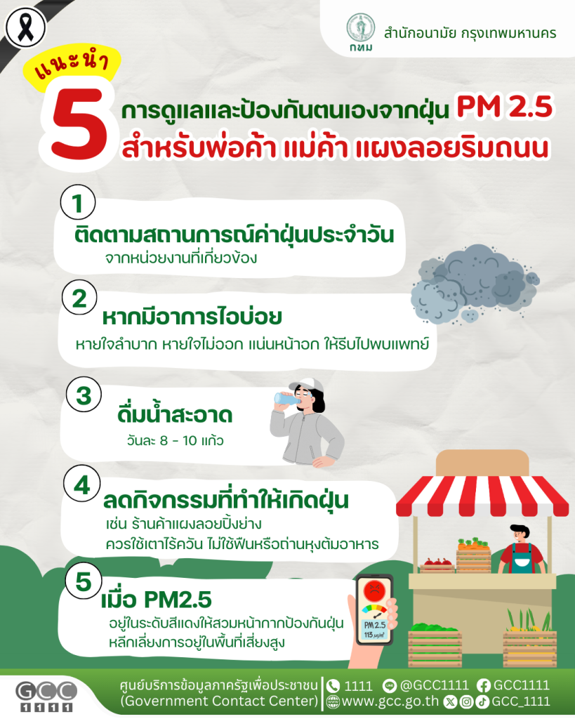 สำนักอนามัย กทม. แนะนำการดูแลและป้องกันตนเองจากฝุ่น PM 2.5 สำหรับพ่อค้า แม่ค้า แผงลอยริมถนน ข่าวสารกิจกรรม สำนักอนามัย กทม. แนะนำการดูแลและป้องกันตนเองจากฝุ่น PM 2.5 สำหรับพ่อค้า แม่ค้า แผงลอยริมถนน สำนักอนามัย กรุงเทพมหานคร แนะนำการดูแลและป้องกันตนเองจากฝุ่น PM 2.5 สำหรับพ่อค้า แม่ค้า แผงลอยริมถนน1. ติดตามสถานการณ์ค่าฝุ่นประจำวัน2. หากมีอาการไอบ่อย หายใจลำบาก หายใจไม่ออก แน่นหน้าอก ให้รีบไปพบแพทย์3. ดื่มน้ำวันละ 8 – 10 แก้ว4. ลดกิจกรรมที่ทำให้เกิดฝุ่น เช่น ร้านค้าแผงลอยปิ้งย่าง ควรใช้เตาไร้ควัน ไม่ใช้ฟืนหรือถ่านหุงต้มอาหาร5. เมื่อ PM2.5 อยู่ในระดับสีแดงให้สวมหน้ากากป้องกันฝุ่น หลีกเลี่ยงการอยู่ในพื้นที่เสี่ยงสูง ที่มา : Facebook สำนักอนามัย กรุงเทพมหานคร Post Views: 26 FacebookFacebookXTwitterLINELine