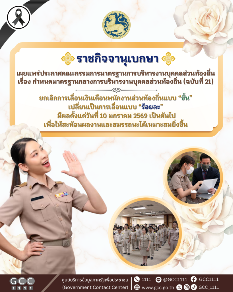 ราชกิจจานุเบกษาเผยแพร่ประกาศเรื่อง กำหนดมาตรฐานกลางการบริหารงานบุคคลส่วนท้องถิ่น โดยยกเลิกการเลื่อนเงินเดือนแบบขั้น “เปลี่ยนเป็นการเลื่อนแบบร้อยละ” ของพนักงานส่วนท้องถิ่น