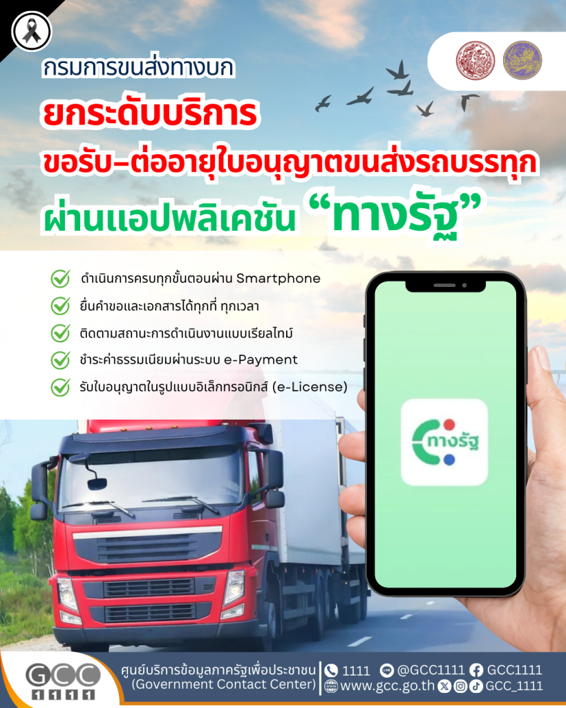 กรมการขนส่งทางบก ยกระดับบริการ ขอรับและต่ออายุใบอนุญาตประกอบการขนส่ง ไม่ประจำทางและส่วนบุคคลด้วยรถบรรทุก ผ่านแอป “ทางรัฐ” สะดวก ง่าย ครบ จบในที่เดียว
