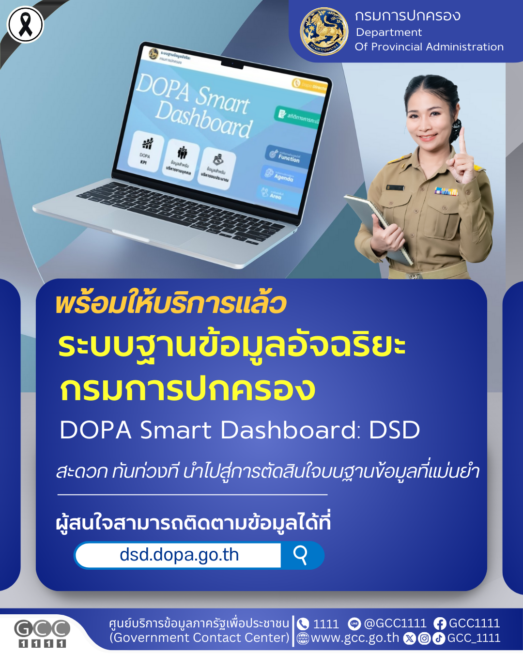 กรมการปกครอง เปิดตัวระบบฐานข้อมูลอัจฉริยะกรมการปกครอง (DOPA Smart Dashboard: DSD) ระบบฐานข้อมูลอัจฉริยะกรมการปกครอง ศูนย์กลางในการรวบรวม เชื่อมโยงข้อมูลในรูปแบบที่เข้าใจง่ายของกรมการปกครอง พร้อมให้บริการแล้ววันนี้