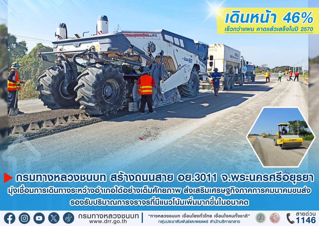 นายพิชิต หุ่นศิริ อธิบดีกรมทางหลวงชนบท เปิดเผยว่า ทช. ได้ดำเนินโครงการก่อสร้างถนนทางหลวงชนบทสาย อย.3011 รวมระยะทางดำเนินการ 12.170 กิโลเมตร ซึ่งเป็นอีกหนึ่งโครงการที่มีความจำเป็นในพื้นที่จังหวัดพระนครศรีอยุธยา เป็นการสนับสนุนภาคการคมนาคมขนส่งโลจิสติกส์ รองรับปริมาณจราจรที่จะเกิดขึ้นในอนาคต พัฒนาโครงข่ายอย่างสมบูรณ์ให้ประชาชนสามารถเดินทางระหว่างอำเภอได้อย่างเต็มศักยภาพ อีกทั้งเป็นการบรรเทาความเดือดร้อนให้กับผู้ใช้ทางในพื้นที่ โดยถนนทางหลวงชนบทสาย อย.3011 เป็นเส้นทางเชื่อมโยงโครงข่ายสายทางระหว่าง ทล.347 และ ทล.3263 สามารถใช้เส้นทางเพื่อเป็นทางลัดเชื่อมในจังหวัด ระหว่าง อำเภอบางไทร และอำเภอเสนา ส่งผลให้มีปริมาณรถบรรทุกหนักเพิ่มขึ้นทุกปี ซึ่งผู้ประกอบการมักใช้เส้นทางดังกล่าวในการขนส่งวัสดุก่อสร้าง เนื่องจากในสายทางมีท่าทรายและอู่ต่อเรือขนาดใหญ่ตั้งอยู่ จึงเป็นเหตุให้สภาพถนนมีความชำรุดเสียหายถึงชั้นโครงสร้างทาง