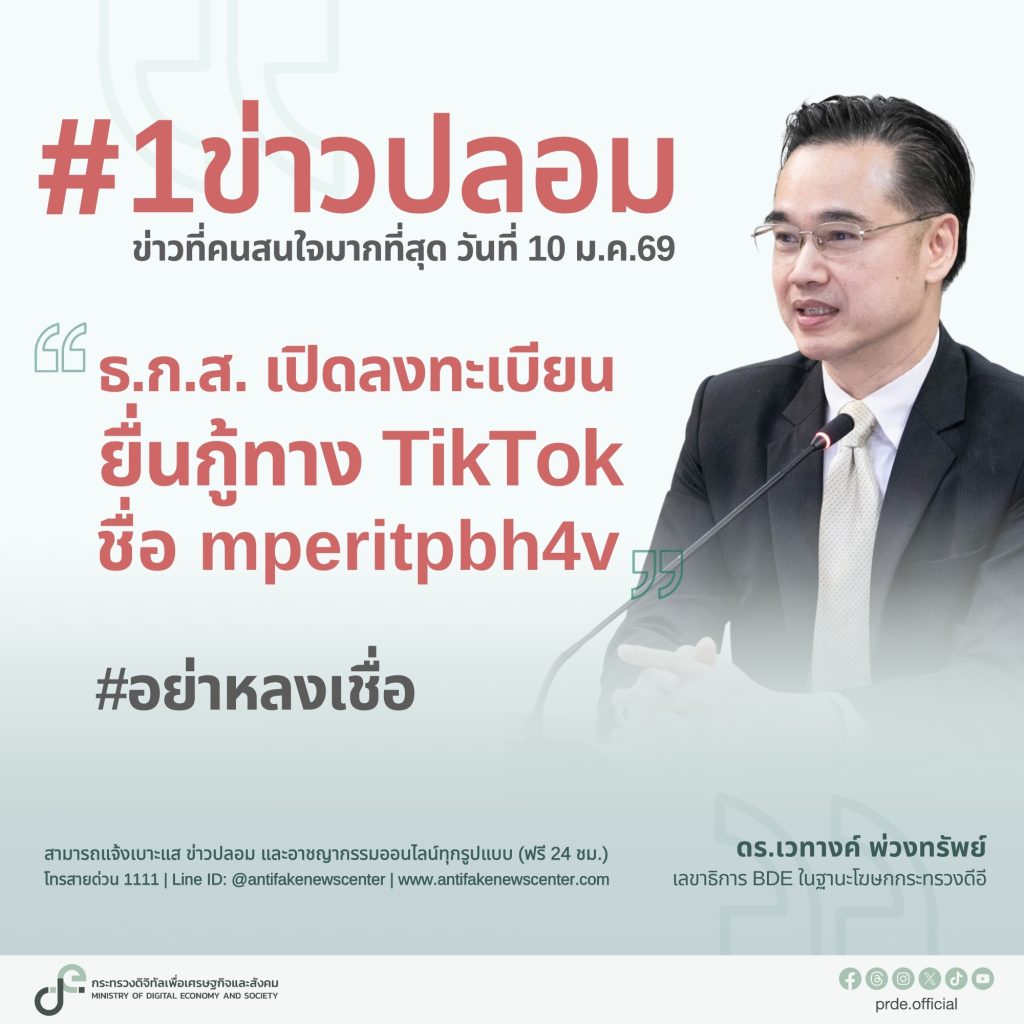 กระทรวงดิจิทัลเพื่อเศรษฐกิจและสังคม เตือนข่าวปลอม “ธ.ก.ส. เปิดลงทะเบียนยื่นกู้ผ่านทาง TikTok” ระวังสูญเงิน-ข้อมูลส่วนบุคคล