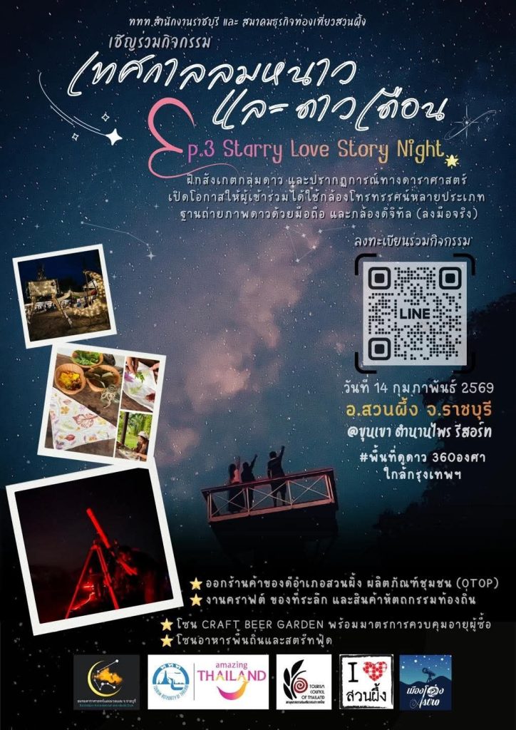 การท่องเที่ยวแห่งประเทศไทย สำนักงานราชบุรี เชิญร่วมกิจกรรมเทศกาลลมหนาวและดาวเดือน “Ep.3 Starry Love Story Night” วันเสาร์ที่ 14 กุมภาพันธ์ 2569 ณ ขุนเขา ตำนานไพร รีสอร์ท อ.สวนผึ้ง จ.ราชบุรี (เขตท้องฟ้ามืด ระดับ 3) ลงทะเบียนร่วมกิจกรรมล่วงหน้า ท่านละ 300.- บาท (รับจำนวน 300 ท่านเท่านั้น) รับคูปองส่วนลด 100.- บาท สำหรับซื้ออาหาร สินค้า และกิจกรรมภายในงาน
