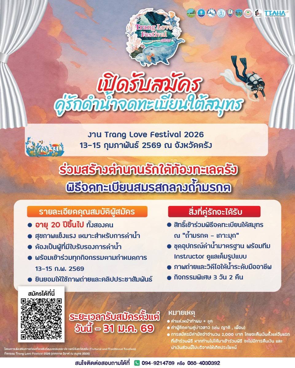 กระทรวงการท่องเที่ยวและกีฬาสำนักงานพังงา เปิดรับสมัคร “คู่รักดำน้ำจดทะเบียนใต้สมุทร” ในงาน Trang Love Festival 2026 วันที่ 13 – 15 กุมภาพันธ์ 2569 ณ จังหวัดตรัง มาร่วมสร้างตำนานรักใต้ท้องทะเลตรัง พิธีจดทะเบียนสมรสกลางภ้ำมรกต ระยะเวลารับสมัครตั้งแต่บัดนี้ – 31 มกราคม 2569