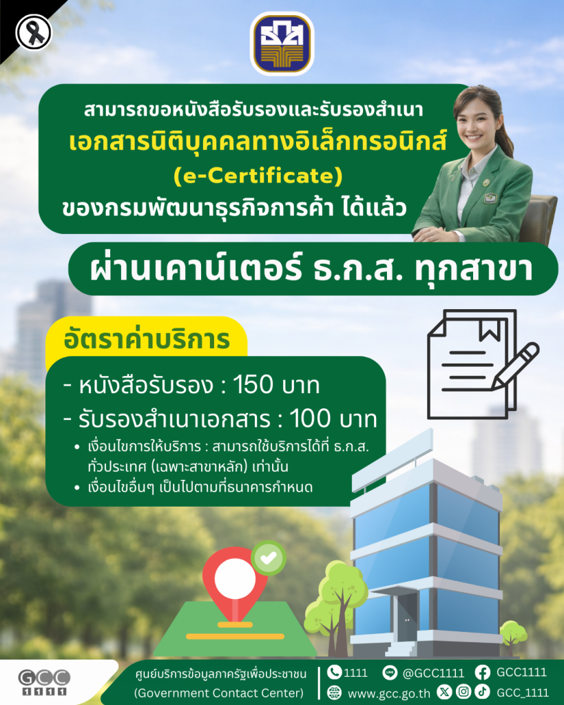 ธนาคารเพื่อการเกษตรและสหกรณ์การเกษตร เผย สามารถขอหนังสือรับรองและรับรองสำเนาเอกสารนิติบุคคลทางอิเล็กทรอนิกส์ (e-Certificate) จากกรมพัฒนาธุรกิจการค้า ได้แล้ว ผ่านเคาน์เตอร์ ธนาคารเพื่อการเกษตรและสหกรณ์การเกษตร ทุกสาขา