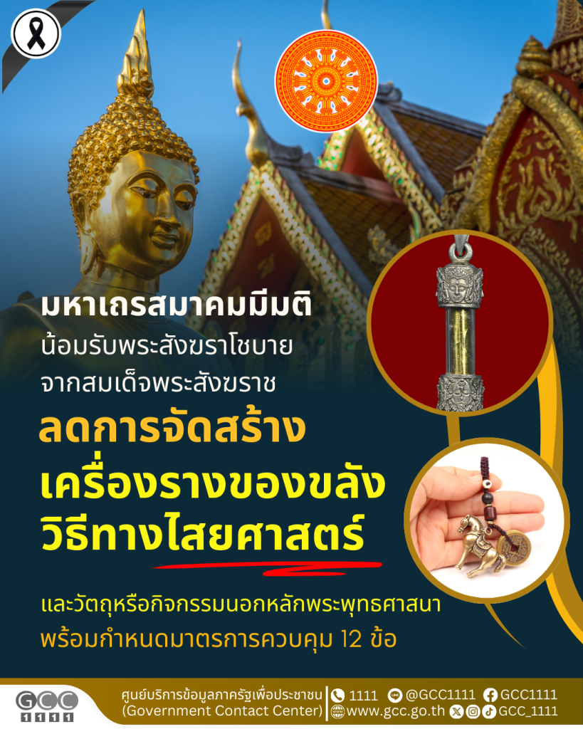 ที่ประชุมมหาเถรสมาคมมีมติน้อมรับพระสังฆราโชบายจากสมเด็จพระสังฆราช เพื่อกิจการคณะสงฆ์และพระพุทธศาสนา 12 ข้อ ควบคุมและลดกิจกรรมที่เบี่ยงเบนจากหลักพระพุทธศาสนา กำหนดมาตรการควบคุมและลดการจัดสร้างหรือส่งเสริมเครื่องรางของขลัง วิธีทางไสยศาสตร์ และวัตถุหรือกิจกรรมนอกหลักพระพุทธศาสนา