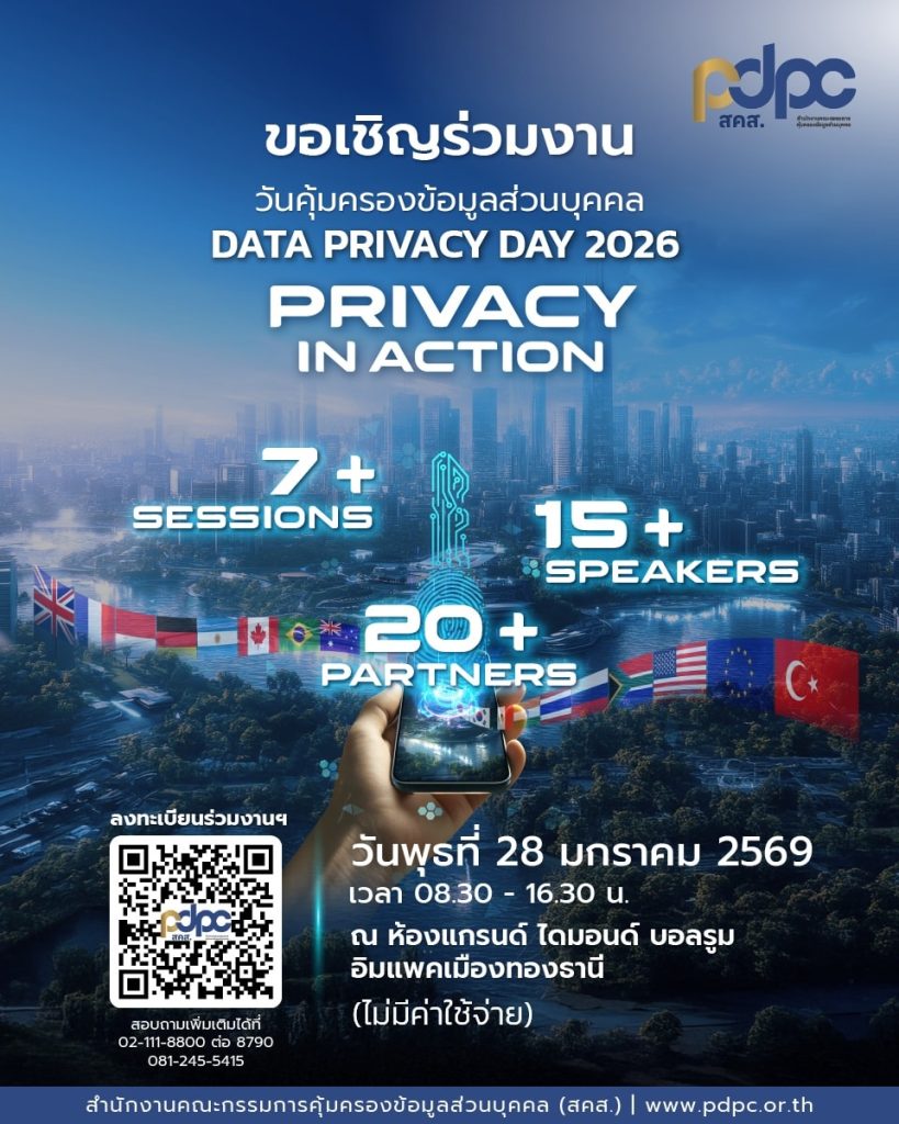 สำนักงานคณะกรรมการคุ้มครองข้อมูลส่วนบุคคล (สคส.) ขอเชิญเข้าร่วมงาน Data Privacy Day 2026 – วันคุ้มครองข้อมูลส่วนบุคคล เวทีสำคัญที่รวบรวมผู้เชี่ยวชาญ หน่วยงานภาครัฐ ภาคธุรกิจ และผู้ที่สนใจ มาร่วมแลกเปลี่ยนมุมมอง อัปเดตองค์ความรู้ด้านการคุ้มครองข้อมูลส่วนบุคคล พร้อมนำเสนอเครื่องมือและแนวทางสำคัญในการเสริมสร้างความพร้อมด้านการปกป้องข้อมูลในยุคดิจิทัล