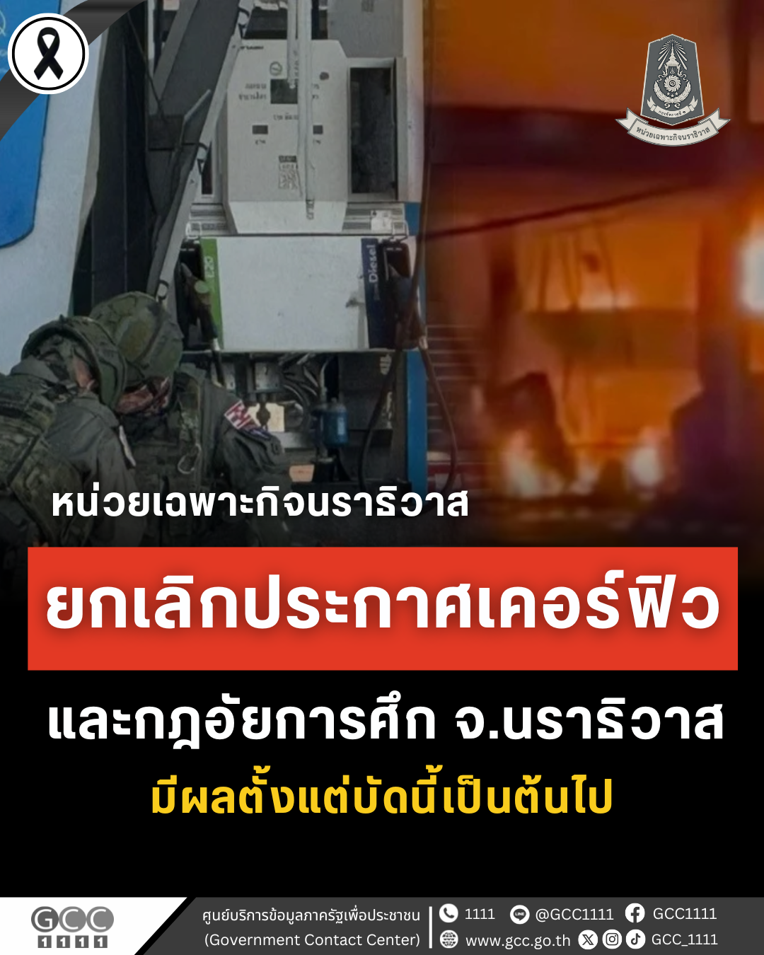 หน่วยเฉพาะกิจนราธิวาส ประกาศยกเลิกประกาศเคอร์ฟิว มีผลตั้งแต่ 12 มกราคม 2569 เป็นต้นไป