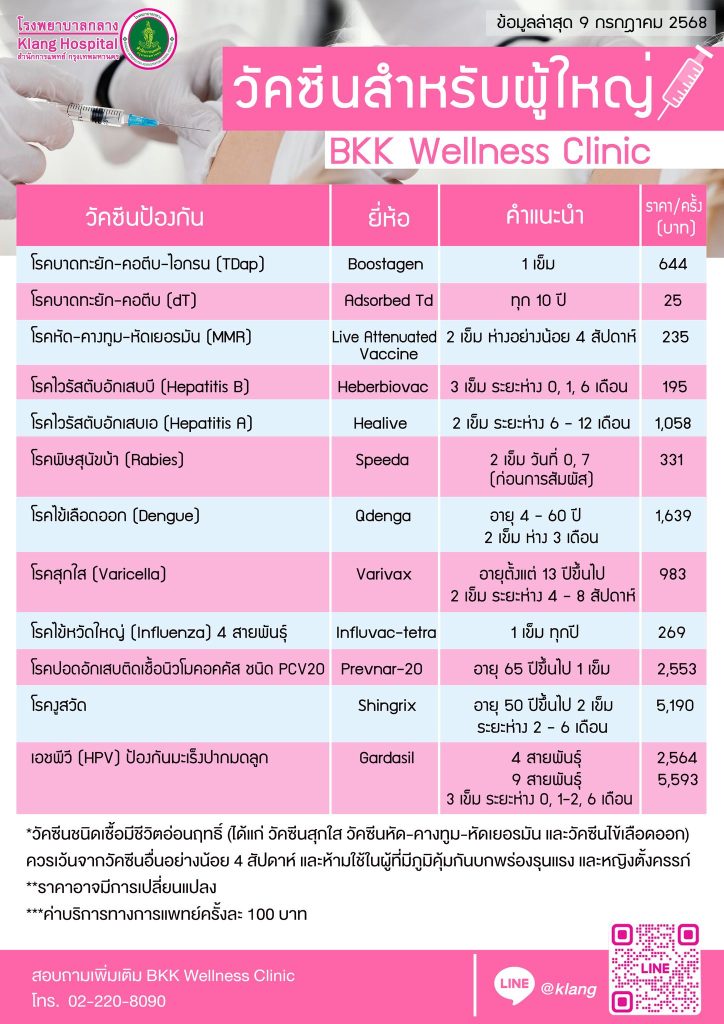 โรงพยาบาลกลาง เปิดเผยตารางวัคซีนสำหรับผู้ใหญ่ ข่าวสารกิจกรรม โรงพยาบาลกลาง เปิดเผยตารางวัคซีนสำหรับผู้ใหญ่ โรงพยาบาลกลาง เปิดเผยตารางวัคซีนสำหรับผู้ใหญ่ คลินิกส่งเสริมสุขภาพและอาชีวเวชกรรม โรงพยาบาลกลางเปิดบริการทุกวัน ไม่เว้นวันหยุดราชการวันจันทร์ – ศุกร์เวลา 08.00 – 20.00 น.วันเสาร์-อาทิตย์และวันหยุดนักขัตฤกษ์เวลา 08.00 – 12.00 น.สอบถามข้อมูลเพิ่มเติมได้ที่คลินิกส่งเสริมสุขภาพและอาชีวเวชกรรม โทร. 02 220 8000 ต่อ 10861 หรือ ศูนย์ UMSC Line ID : @klang ที่มา : Facebook โรงพยาบาลกลาง BMA General Hospital Post Views: 17 FacebookFacebookXTwitterLINELine