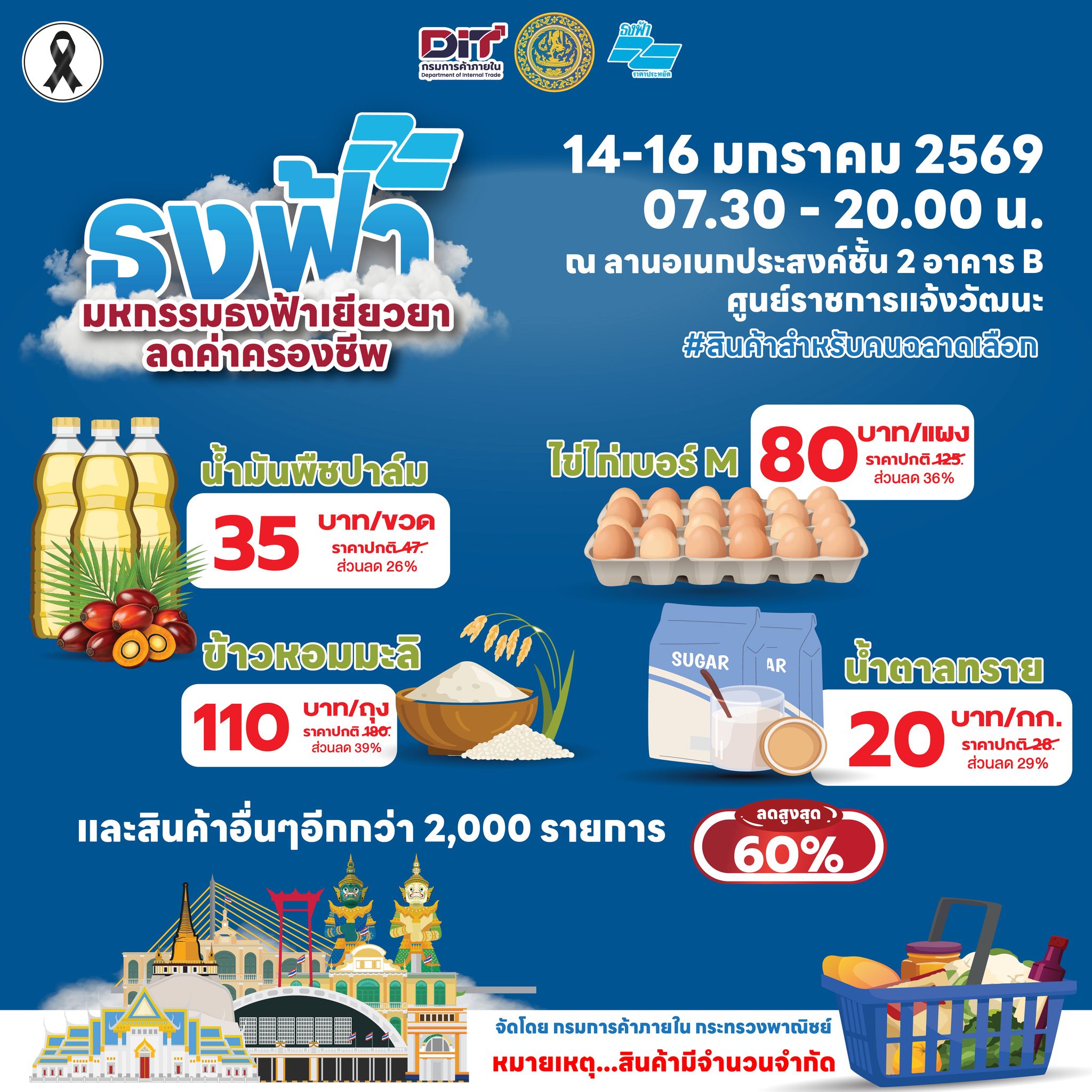 กรมการค้าภายใน จัดงาน “มหกรรมธงฟ้าเยียวยา ลดค่าครองชีพ” วันที่ 14 – 16 มกราคม 2569 เวลา 07.30 – 20.00 น. ณ ลานอเนกประสงค์ ชั้น 2 อาคาร B ศูนย์ราชการเฉลิมพระเกียรติฯ ถนนแจ้งวัฒนะ กรุงเทพฯ พบกับสินค้าจำเป็นราคาประหยัด คัดสรรเพื่อประชาชน ลดสูงสุด 60%และสินค้าอุปโภคบริโภคอื่น ๆ มากกว่า 2,000 รายการ (สินค้ามีจำนวนจำกัด)
