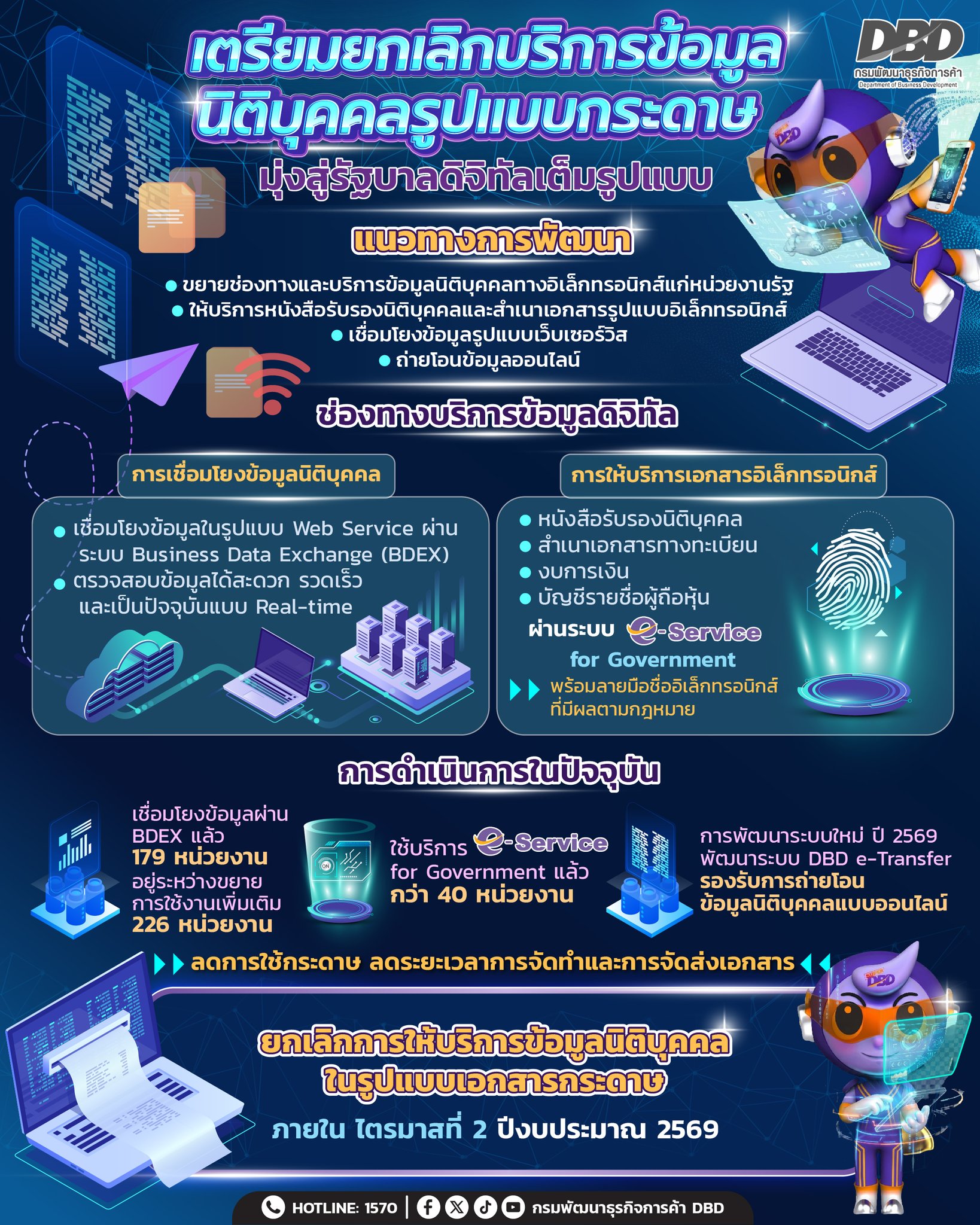 กรมพัฒนาธุรกิจการค้า เดินหน้าสู่รัฐบาลดิจิทัลเต็มรูปแบบ ข่าวสารกิจกรรม กรมพัฒนาธุรกิจการค้า เดินหน้าสู่รัฐบาลดิจิทัลเต็มรูปแบบ DBD เดินหน้าสู่รัฐบาลดิจิทัลเต็มรูปแบบ เตรียมยกเลิกการให้บริการข้อมูลนิติบุคคลในรูปแบบเอกสารกระดาษ เปลี่ยนผ่านสู่การให้บริการข้อมูลและเอกสารอิเล็กทรอนิกส์อย่างครบวงจร พัฒนาช่องทางบริการดิจิทัล ทั้งการเชื่อมโยงข้อมูลนิติบุคคลผ่านระบบ BDEX แบบ Real-time และการให้บริการเอกสารอิเล็กทรอนิกส์ผ่าน e-Service for Government พร้อมลายมือชื่ออิเล็กทรอนิกส์ที่ถูกต้องตามกฎหมาย ปัจจุบันมีหน่วยงานรัฐเชื่อมโยงข้อมูลแล้วจำนวนมาก และอยู่ระหว่างขยายการใช้งานอย่างต่อเนื่อง ช่วยลดการใช้กระดาษ ลดระยะเวลา และเพิ่มความสะดวกรวดเร็วในการทำงานภาครัฐ เตรียมยกเลิกการให้บริการข้อมูลนิติบุคคลแบบกระดาษ ภายในไตรมาสที่ 2 ปีงบประมาณ 2569 ก้าวสู่ระบบดิจิทัล โปร่งใส ทันสมัย และตอบโจทย์การบริการยุคใหม่ ที่มา : Facebook : กรมพัฒนาธุรกิจการค้า Post Views: 10 FacebookFacebookXTwitterLINELine
