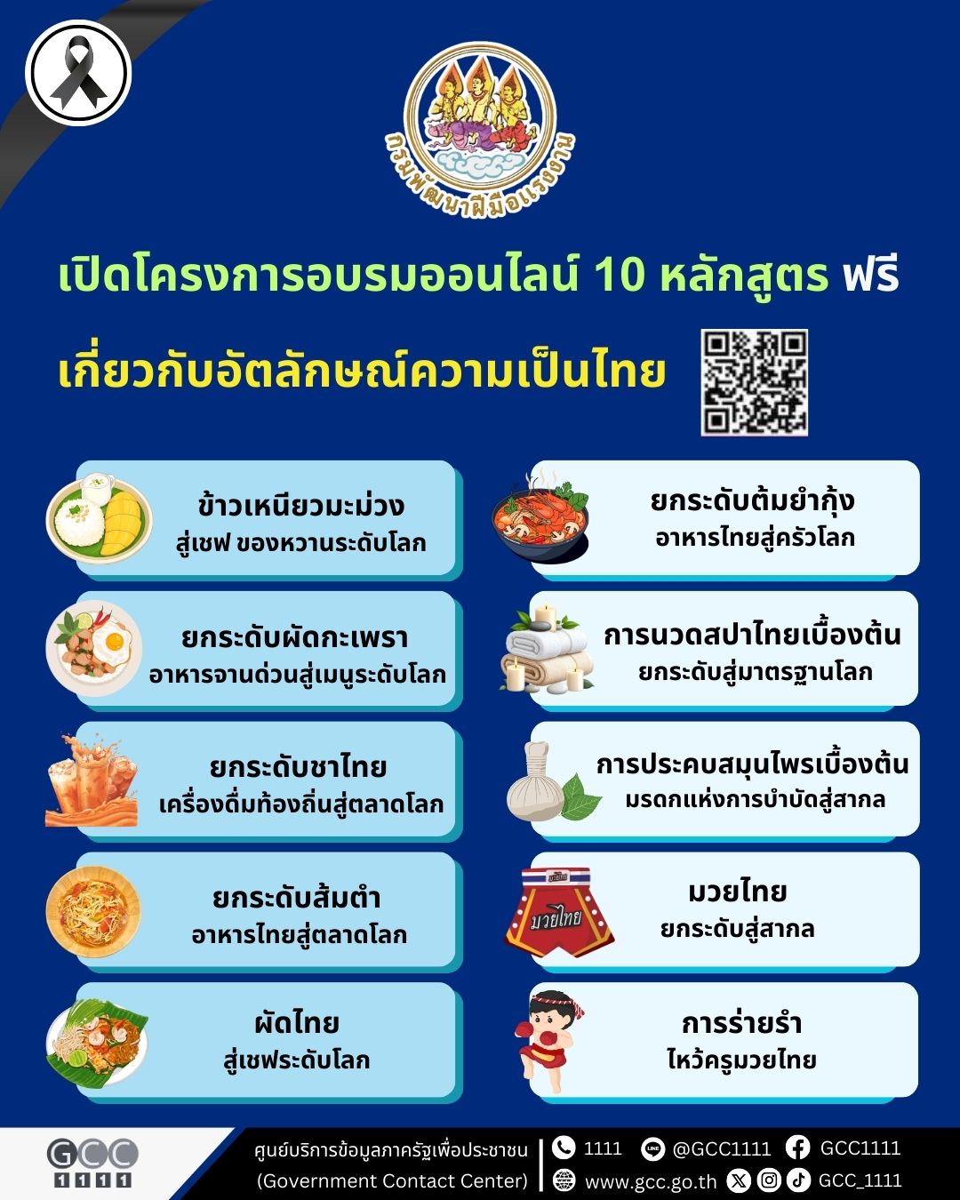 กรมพัฒนาฝีมือแรงงาน เปิดโครงการอบรมออนไลน์ 10 หลักสูตรฟรี ไม่มีค่าใช้จ่าย เกี่ยวกับอัตลักษณ์ความเป็นไทย เพื่อพัฒนาทักษะแรงงานไทย หลักสูตรครอบคลุมทั้งอาหารไทย นวดแผนไทย มวยไทย และศิลปวัฒนธรรมไทยหลากหลายแขนง ผู้สนใจสามารถเรียนรู้ได้ทุกที่ ทุกเวลา โดยมีวิทยากรผู้เชี่ยวชาญร่วมถ่ายทอดความรู้ การอบรมจัดทำในรูปแบบ e-Learning