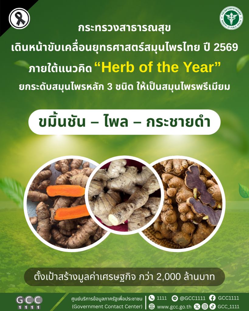 กระทรวงสาธารณสุข ร่วมกับ 5 กระทรวงหลัก สาธารณสุข – เกษตรฯ – อุตสาหกรรม – พาณิชย์ – การอุดมศึกษาฯ ขับเคลื่อนยุทธศาสตร์สมุนไพรไทย ปี 2569 ภายใต้แนวคิด “Herb of the Year” ปั้นขมิ้นชัน ไพล กระชายดำ เป็นพรีเมียมโปรดักต์บุกตลาดโลก ตั้งเป้าสร้างมูลค่าเศรษฐกิจกว่า 2,000 ล้านบาท พร้อมต่อยอดเมืองสมุนไพรสู่การขับเคลื่อนเศรษฐกิจ สร้างรายได้ให้ชุมชนอย่างยั่งยืน