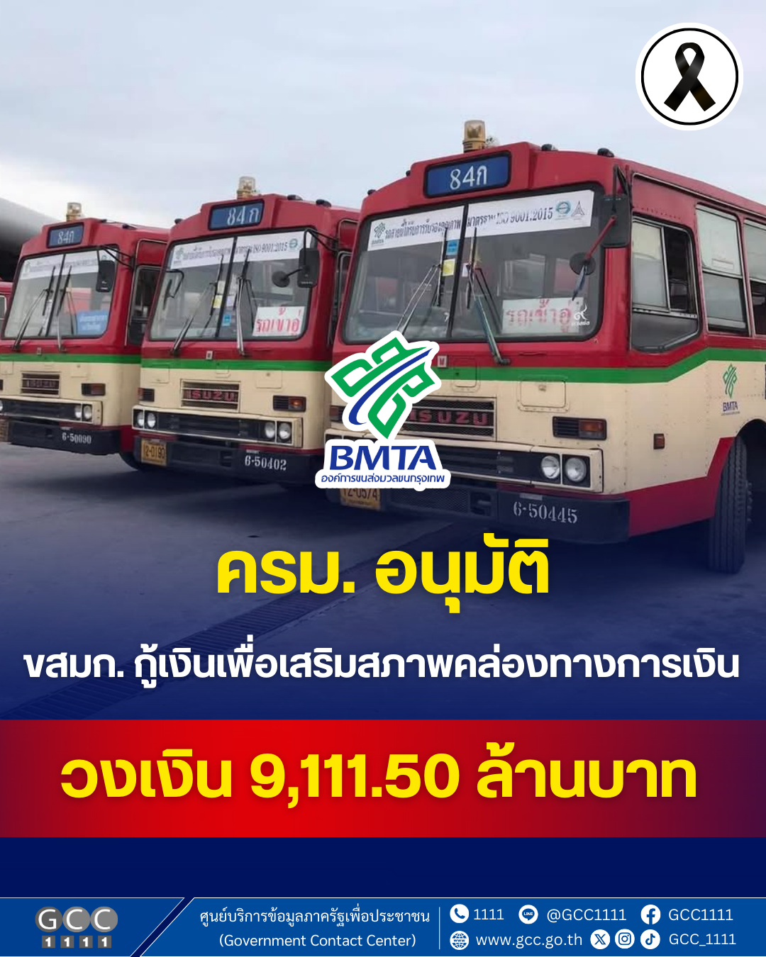 ครม. อนุมัติให้ ขสมก. กู้เงินเพื่อเสริมสภาพคล่องทางการเงิน ประจำปีงบประมาณ พ.ศ. 2569 วงเงิน 9,111.50 ล้านบาท โดยมอบหมายให้กระทรวงการคลังเป็นผู้ค้ำประกันเงินกู้ เพื่อใช้เป็นเงินสดหมุนเวียนในการดำเนินงาน